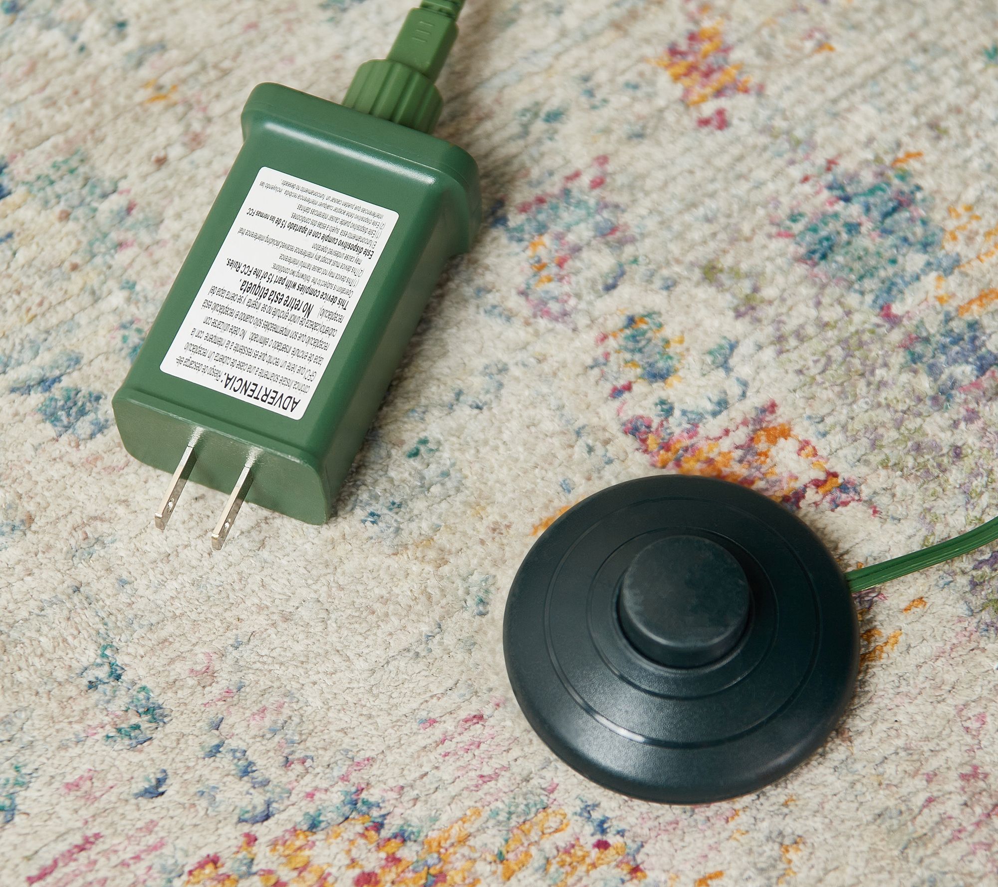 Includes pre-lit tree, remote control, foot pedal, plug-in cord, and metal stand