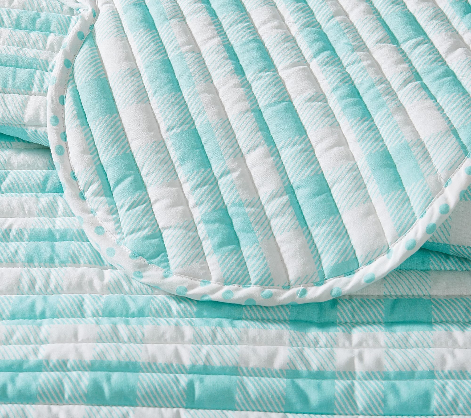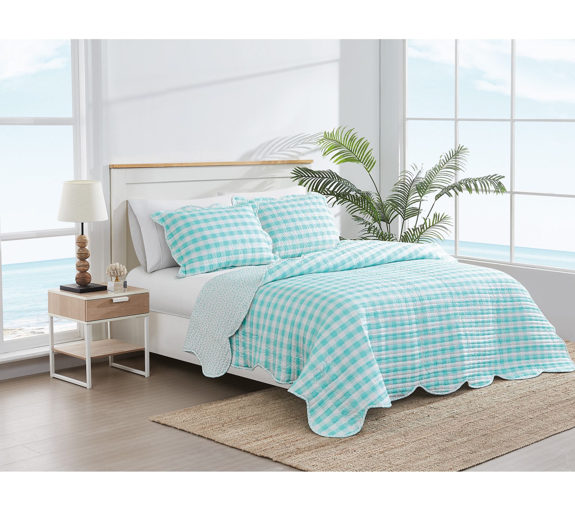 Refresh your bedroom with the SCOUT Barnaby Checkham king quilt set, adding playful energy and a bold grid pattern to your space with crisp white and turquoise colors. Effortlessly versatile and lightweight, this set layers beautifully for year-round comfort and is fully reversible for a quick style change. Cozy up with cool-to-the-touch comfort and enjoy coordinated shams that give your room a polished finish. From SCOUT.