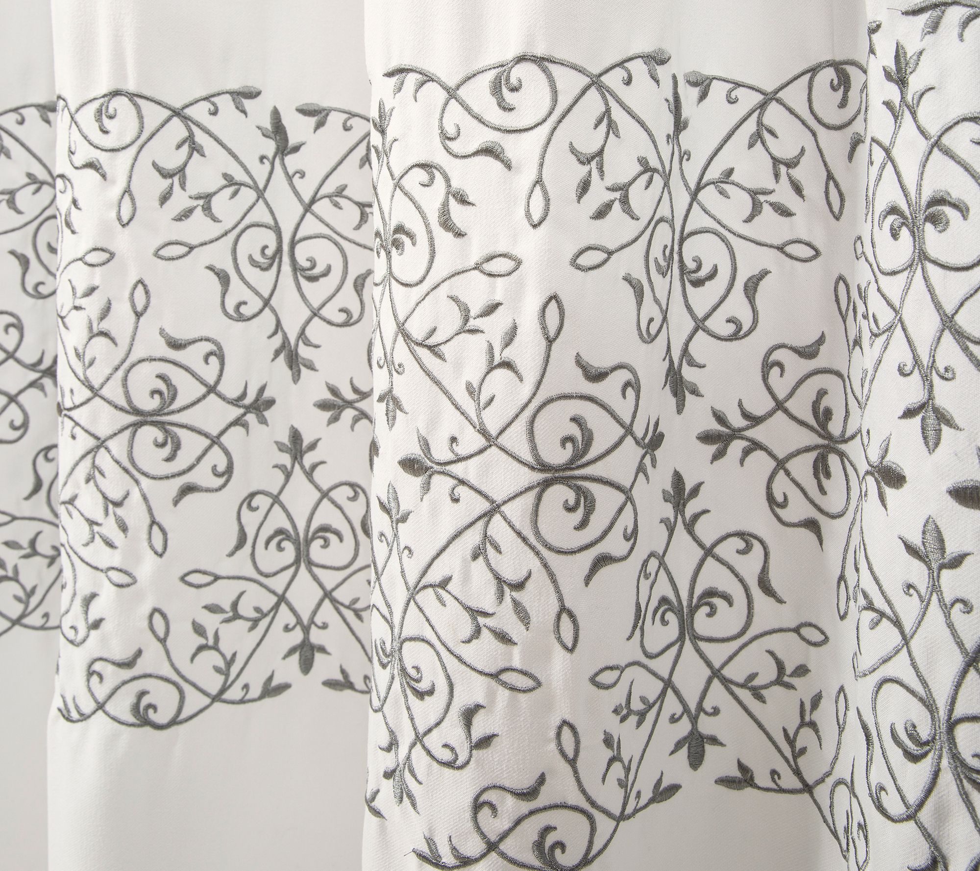 Embroidered with an elegant scroll design, this shower curtain could be a focal point for your lavish lavatory. From Lush Decor.
