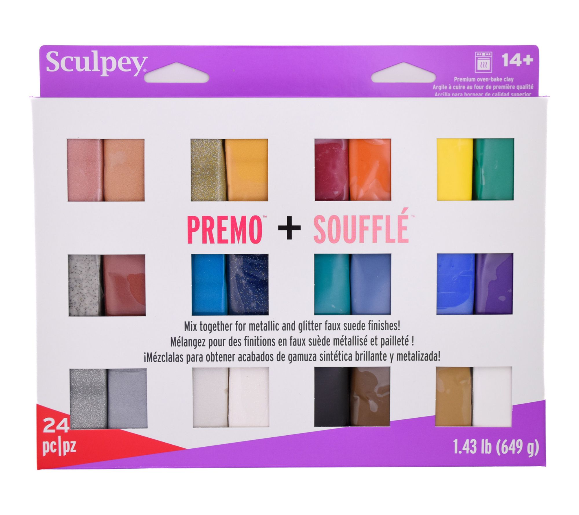 • Includes 12 1-oz Premo bars in assorted metallic and glitter colors and 12 0.9-oz Souffle bars in assorted colors