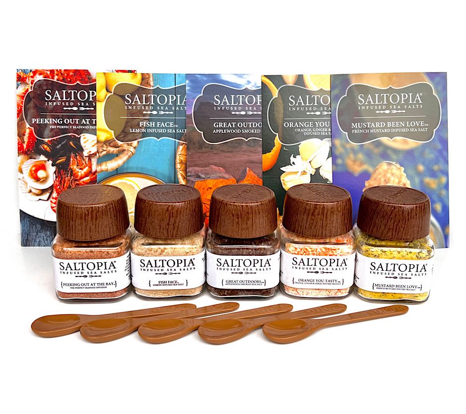 • Includes five 3.4-oz glass jars of spice-infused sea salts, five spoons, five recipe cards, and gift box
