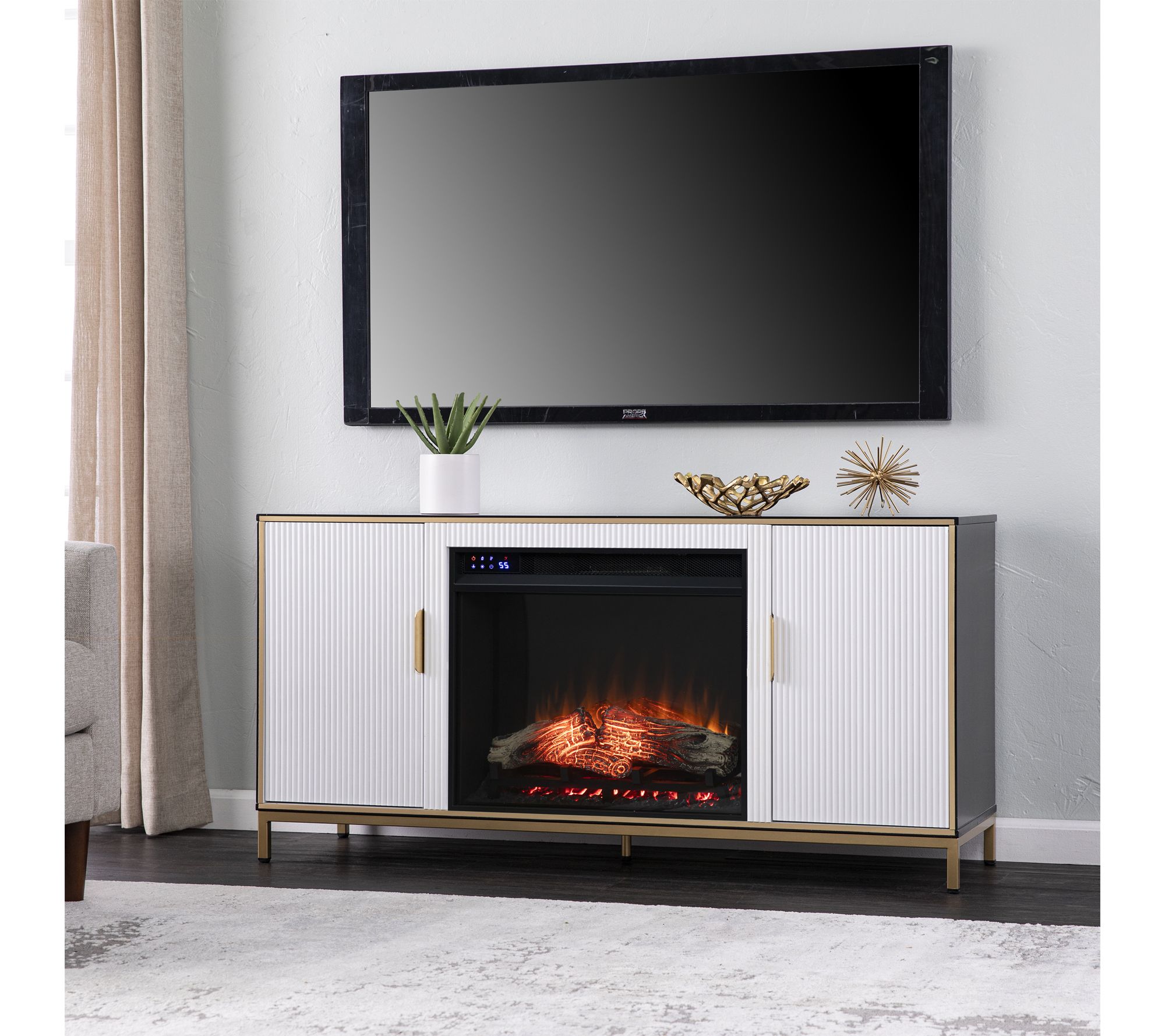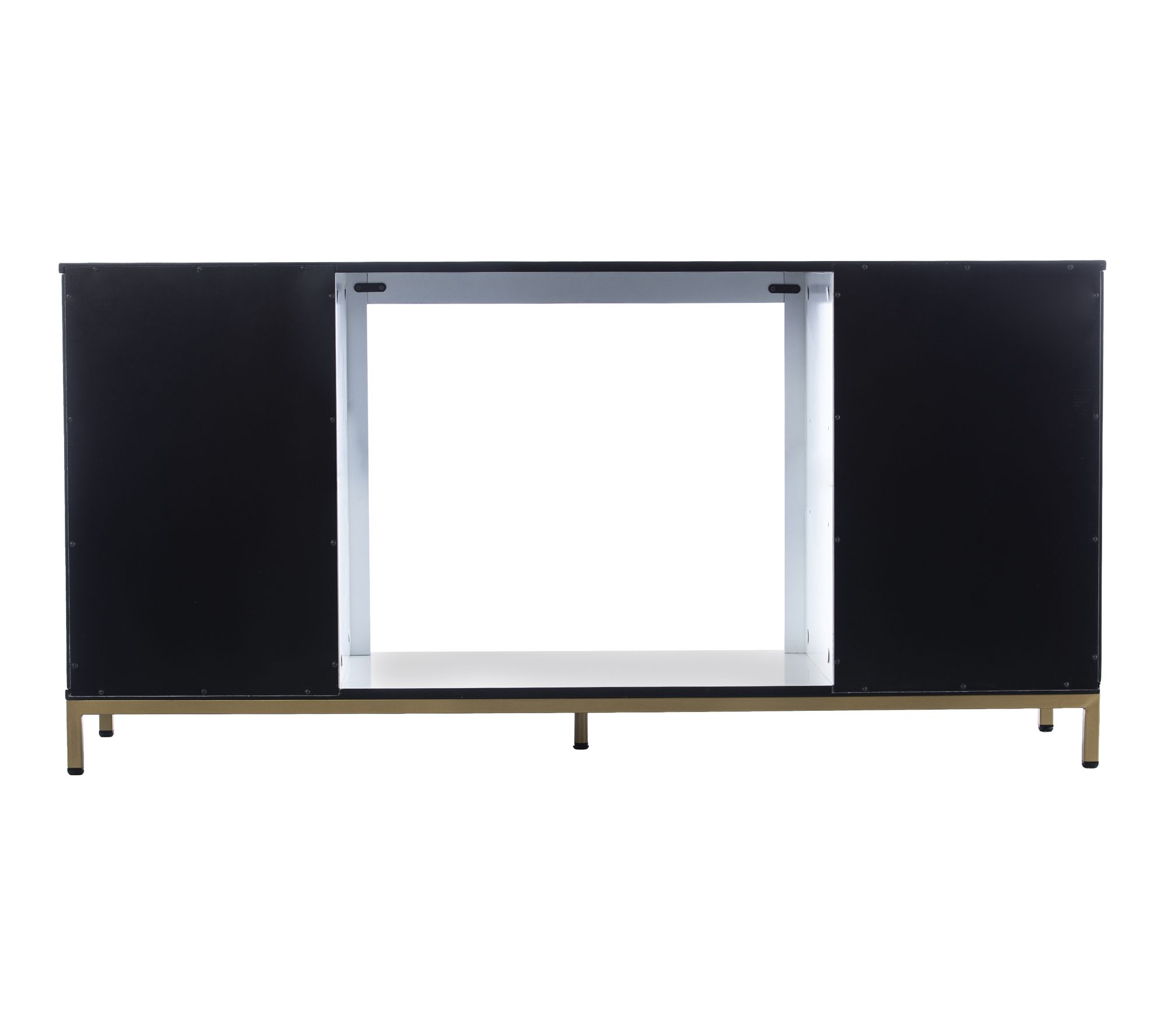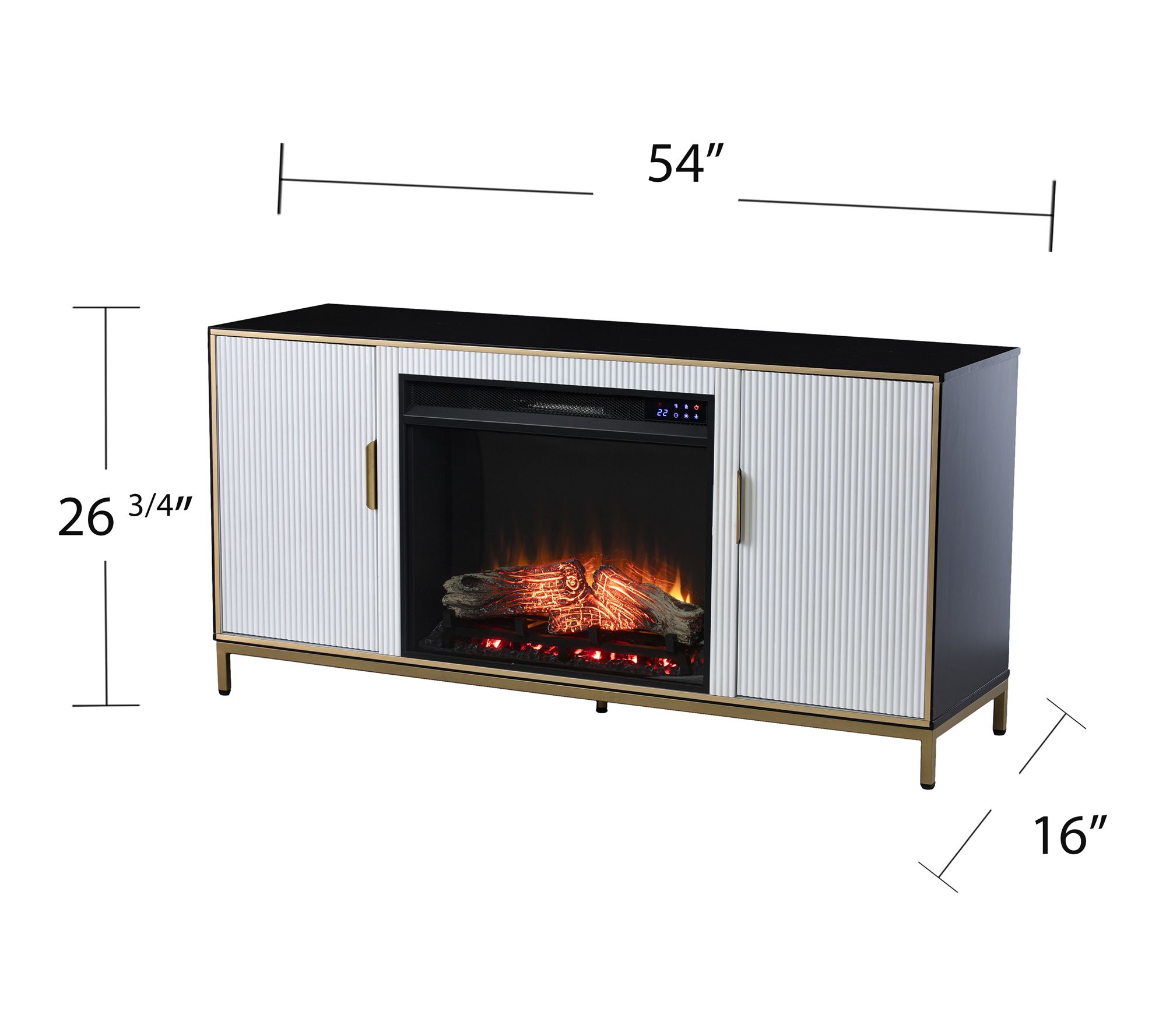 Enjoy cozy movie nights and stylish gatherings with this electric fireplace, offering a modern black-and-white design, flickering LED flames, and discreet storage for your favorite games and consoles. Remote-controlled convenience and adjustable heating options create the ideal ambiance for any occasion, whether you want warmth or simply the inviting look of a glowing fire. From SEI.
