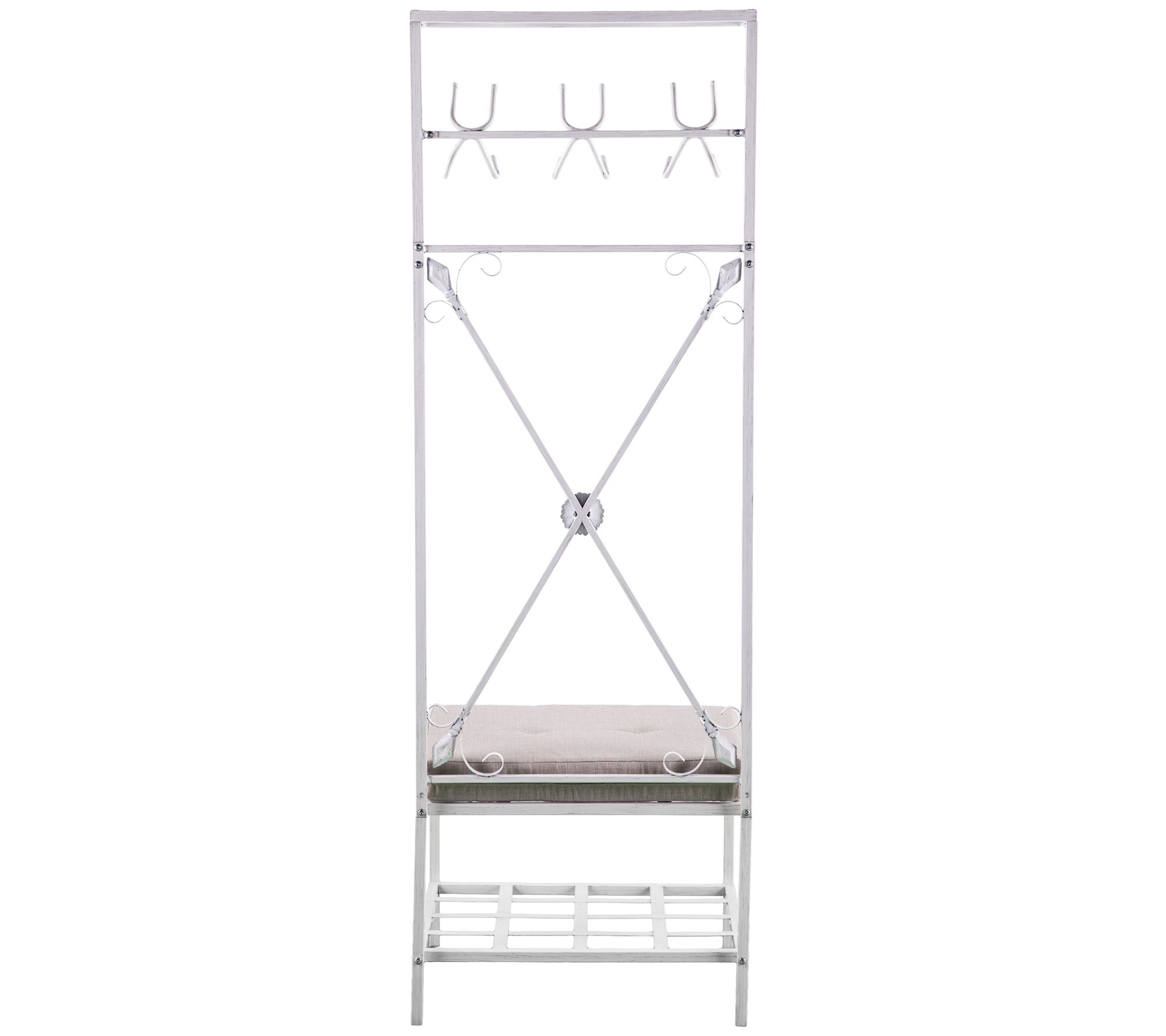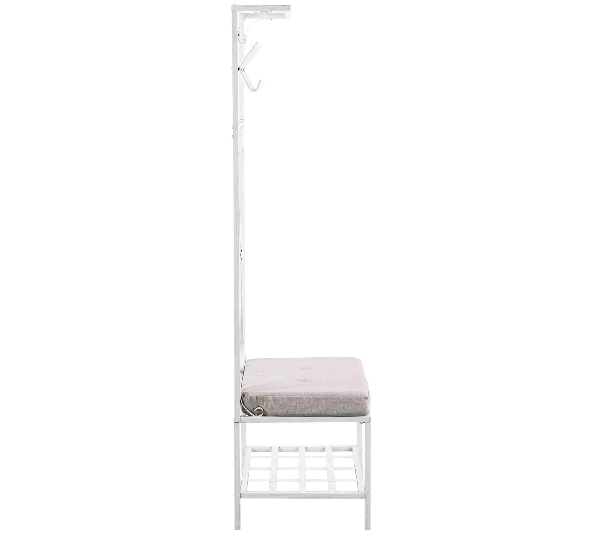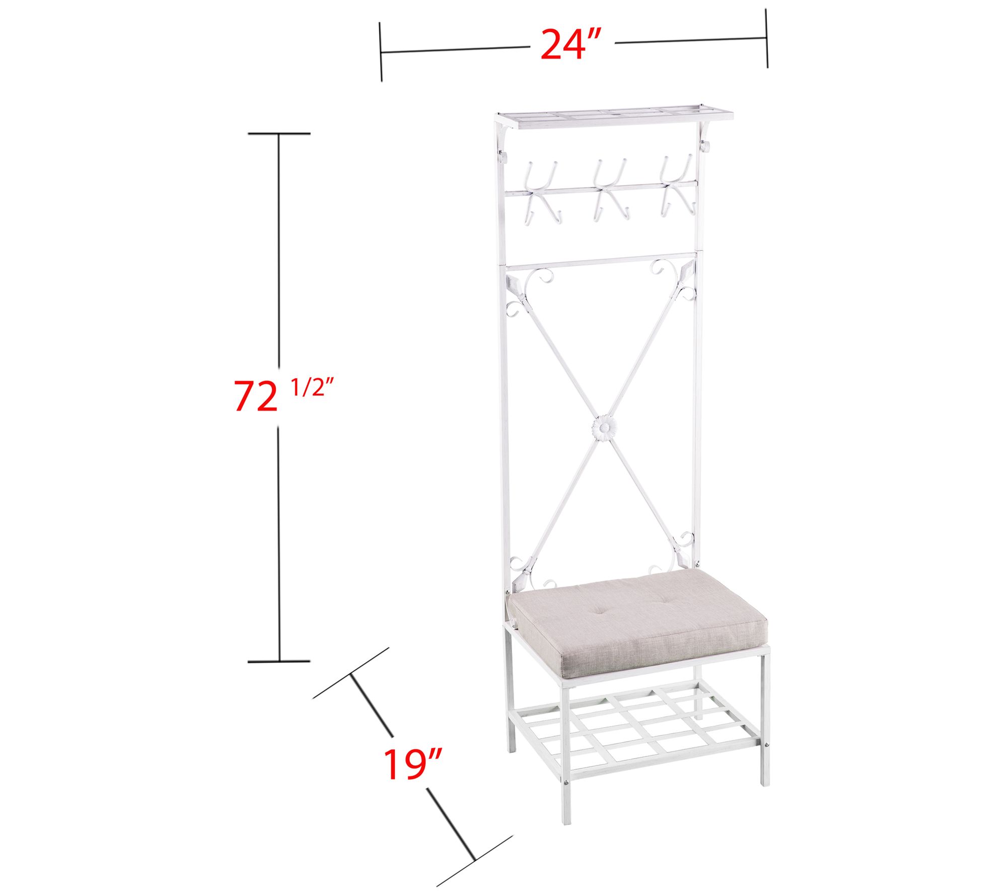 • Measures approximately 24" W x 19" D x 72.5" H; supports up to 250 lbs (seat), 20 lbs (each shelf), 3 lbs (each hook)