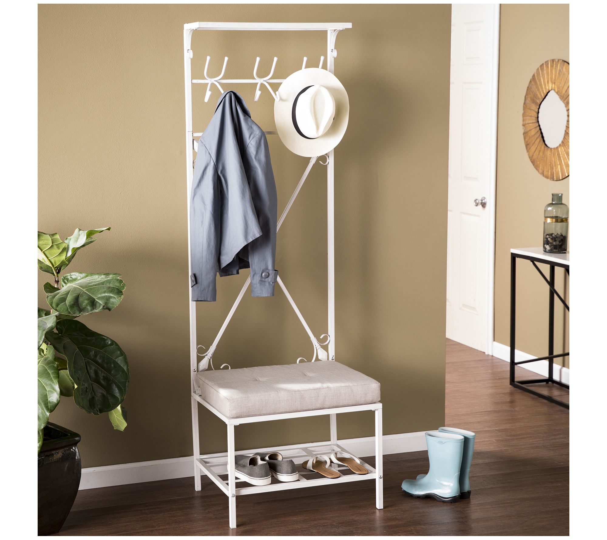 Add a touch of elegance and functionality to your entryway with this versatile storage hall tree. With a plush padded seat perfect for putting on shoes or unwinding, and 12 hooks to keep your gear organized, it's ideal for busy mornings or relaxing evenings. Stylish scrollwork and ventilated shelves make this bench a seamless blend of fashion and function for small spaces. From SEI.