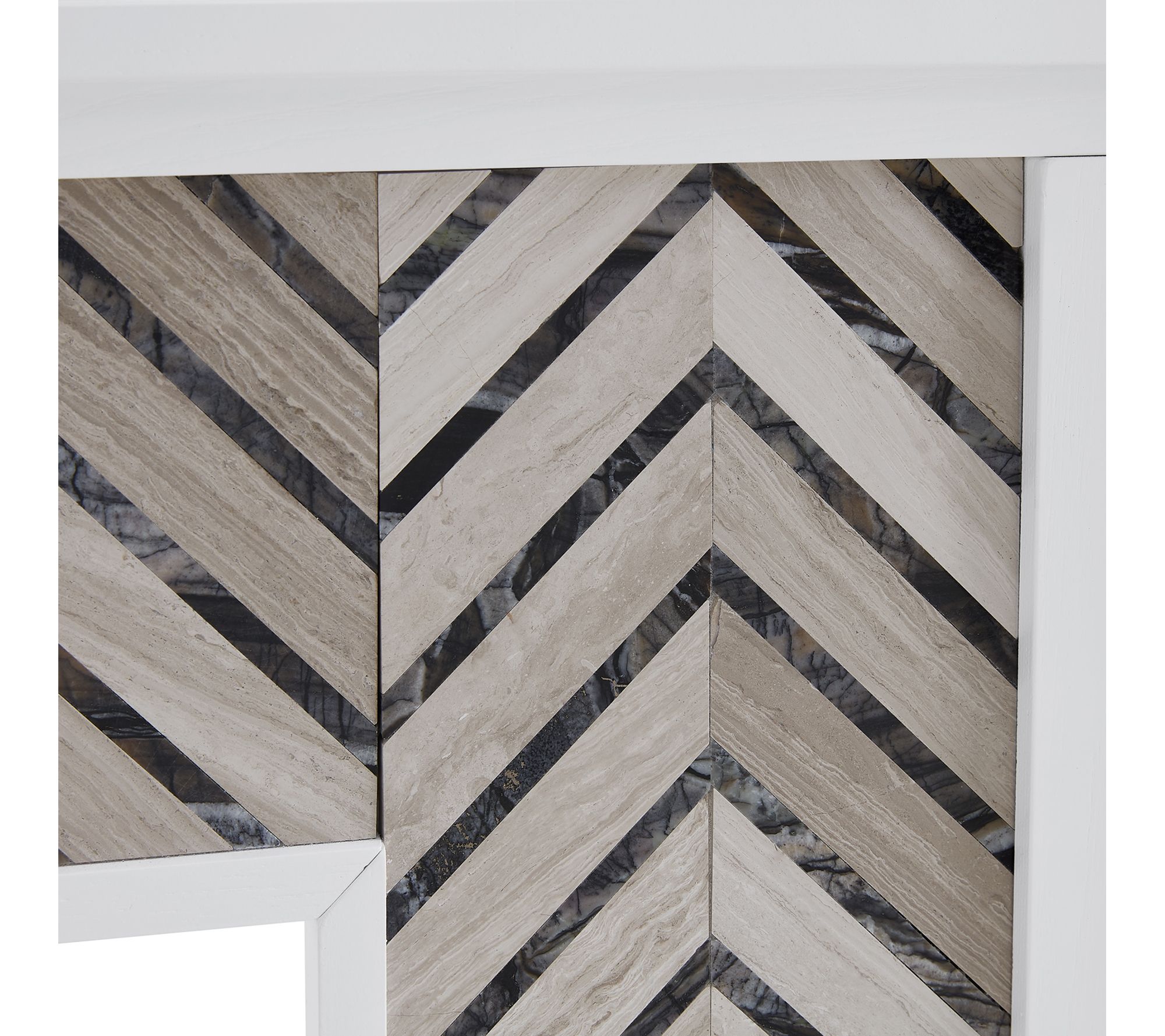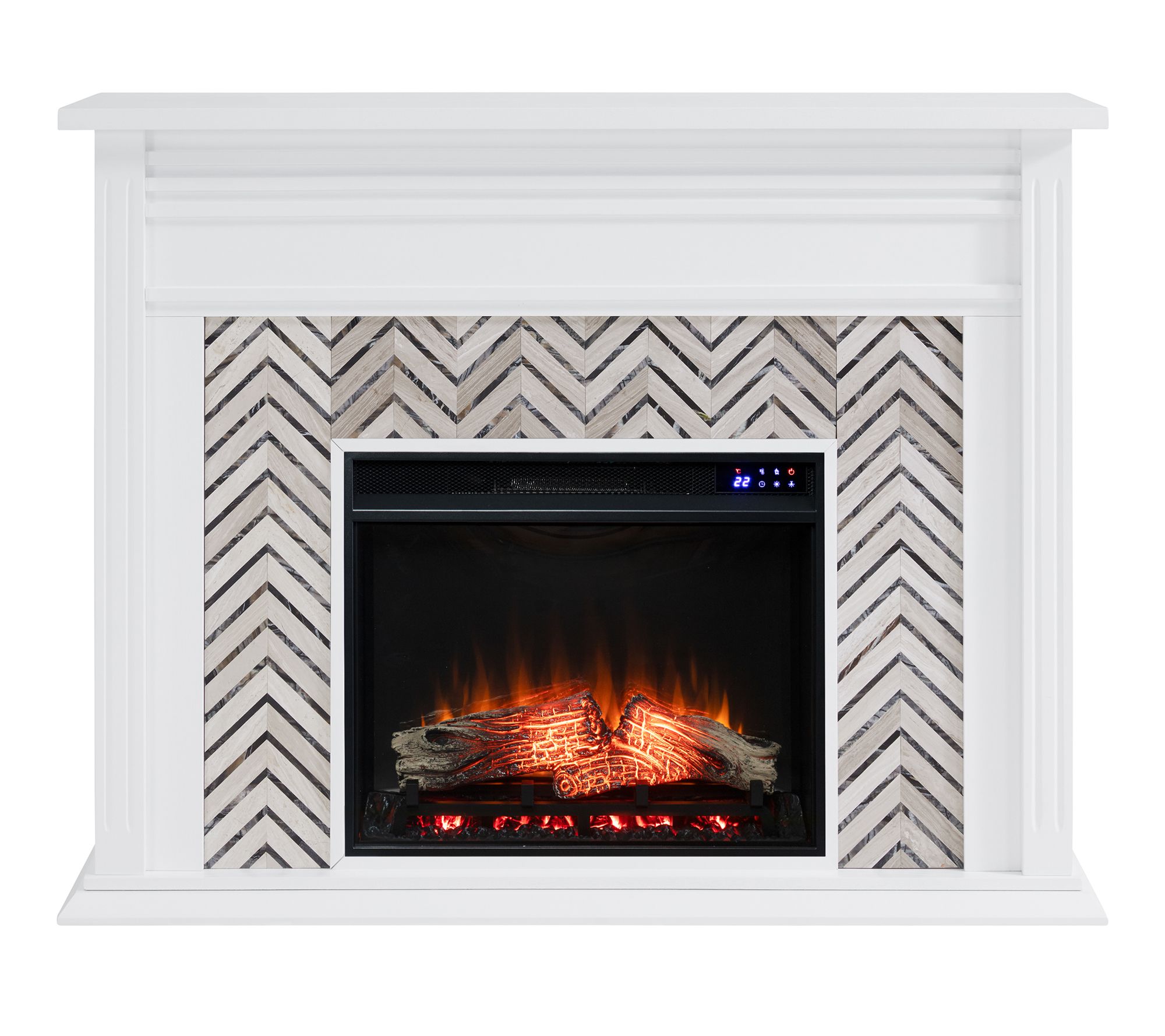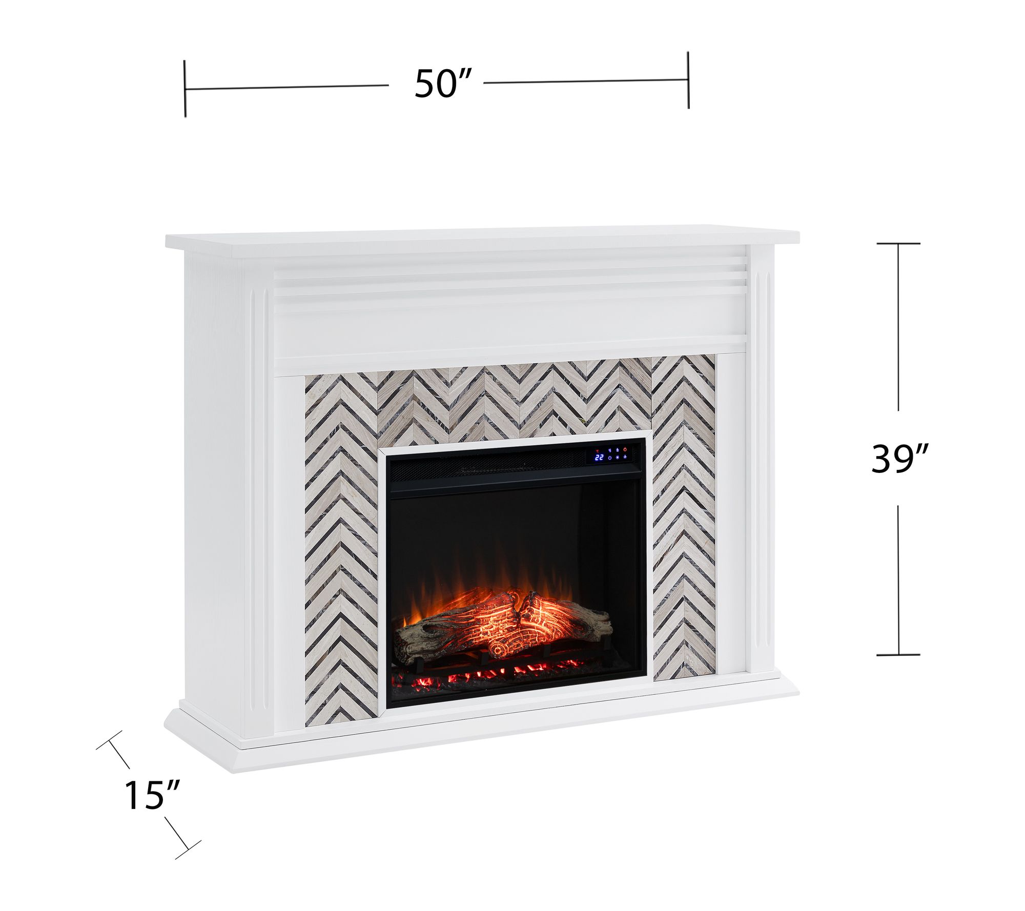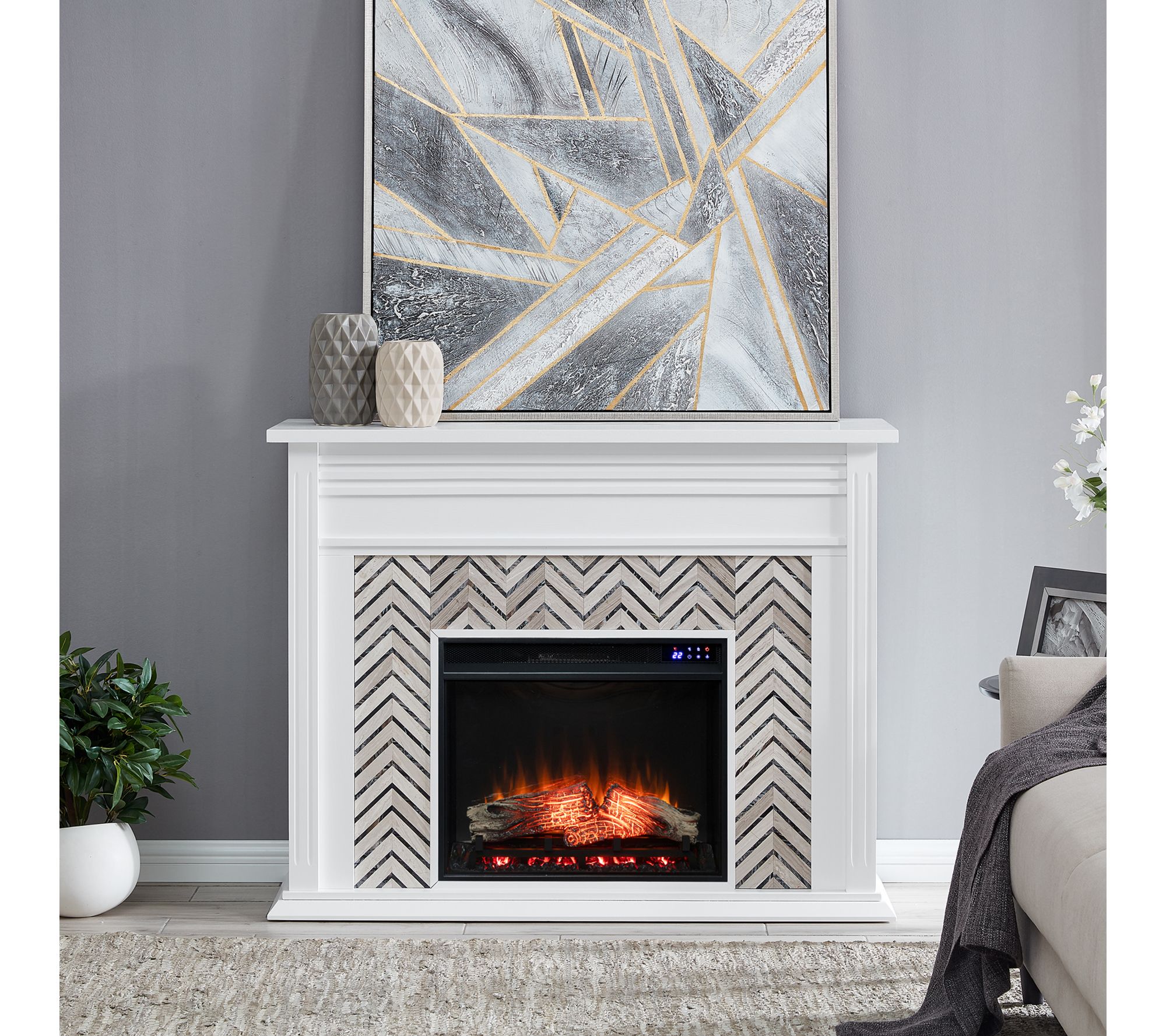 Transform your lounge or open-concept area with an electric fireplace that blends modern color and classic style. Real marble tiles create a striking zigzag pattern on a crisp white mantel, while flickering LED flames and glowing faux fire logs fill the room with cozy ambiance -- heat optional. A touch screen and remote put comfort right at your fingertips. From SEI.
