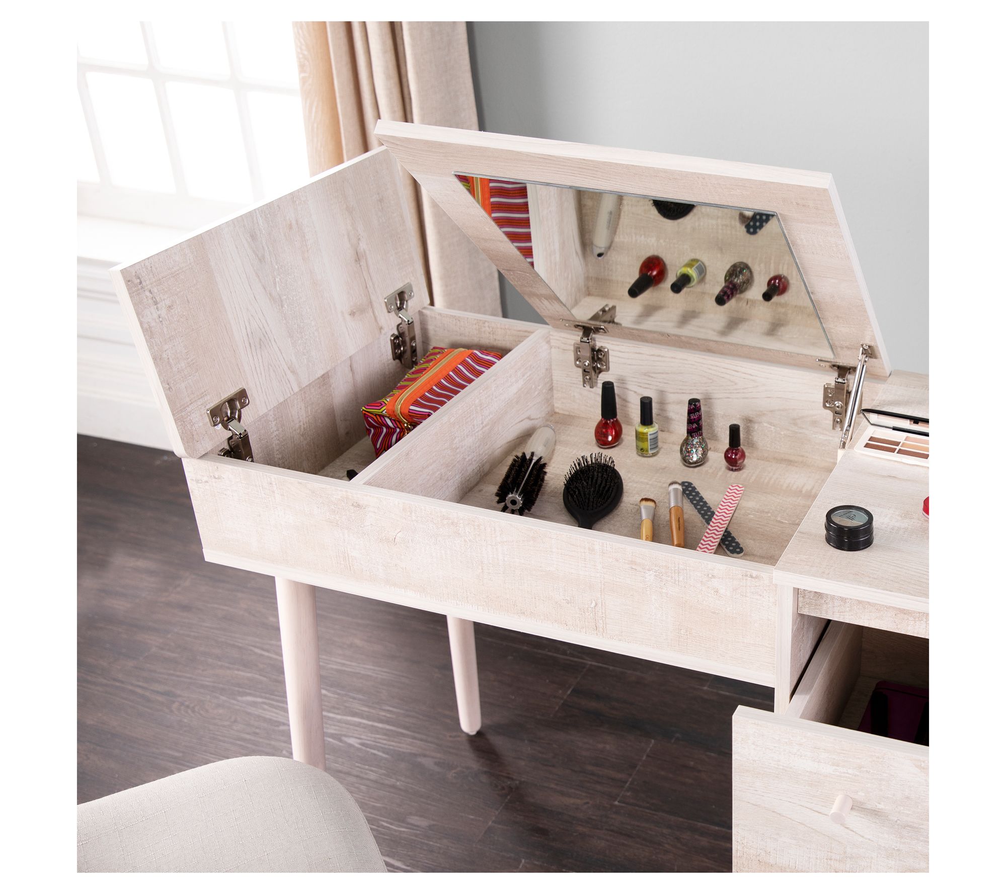 • Flip-up mirror with hidden storage compartment