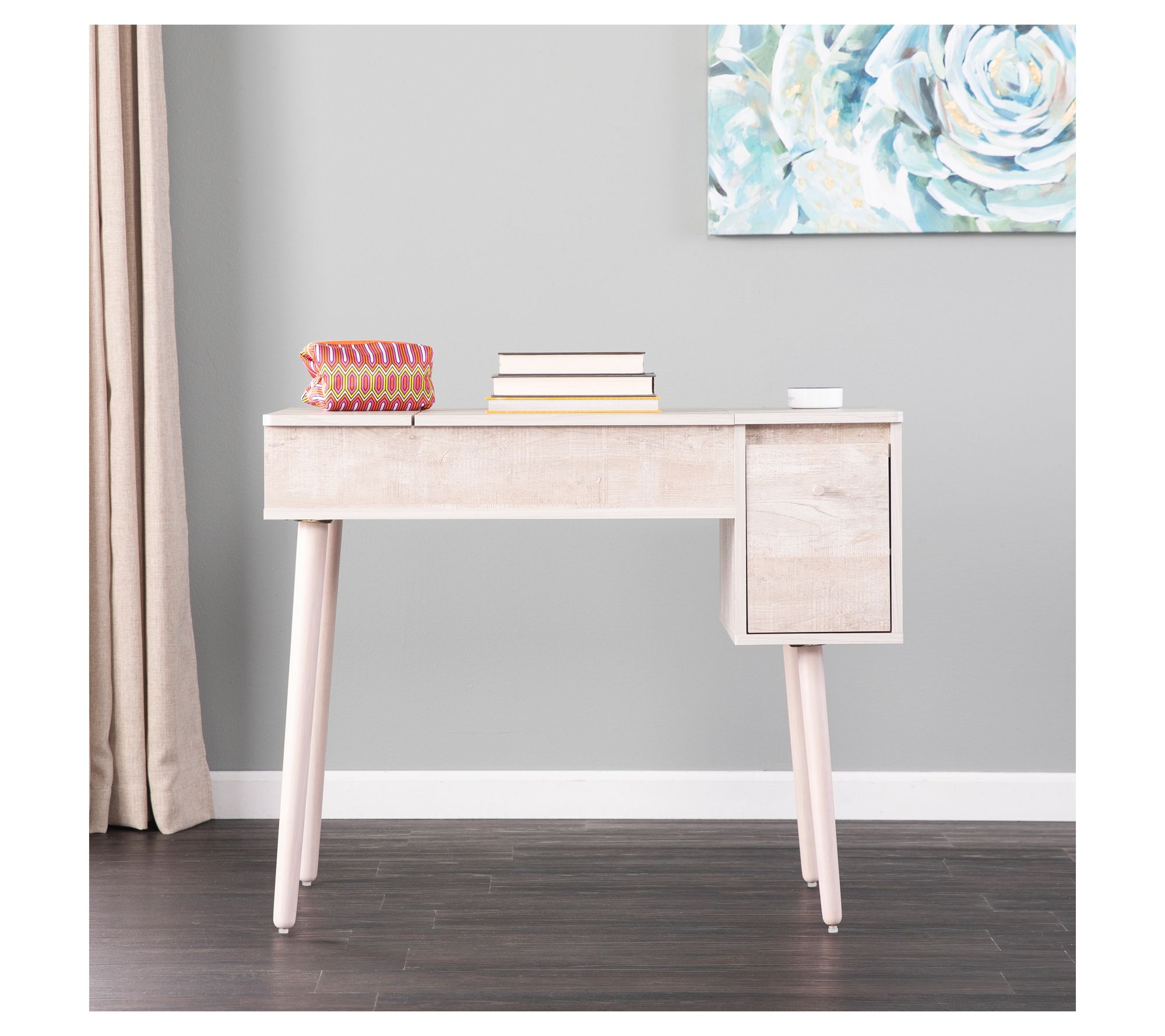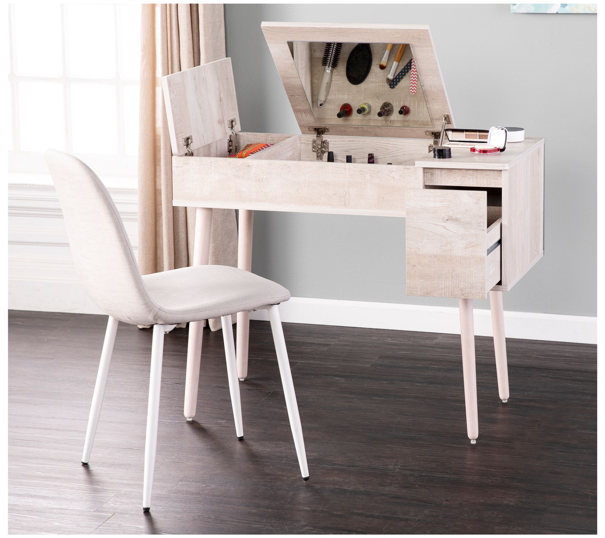 Transform your daily routine with the Harzen Vanity, designed for both style and organization. Imagine starting your day with a flip-up mirror revealing a spacious storage compartment, perfect for your hair tools and makeup. With a deep drawer and another flip-up compartment, everything in your dressing area stays neatly tucked away. This versatile piece can even double as a desk in your home office, maximizing functionality without compromising on style. From SEI.