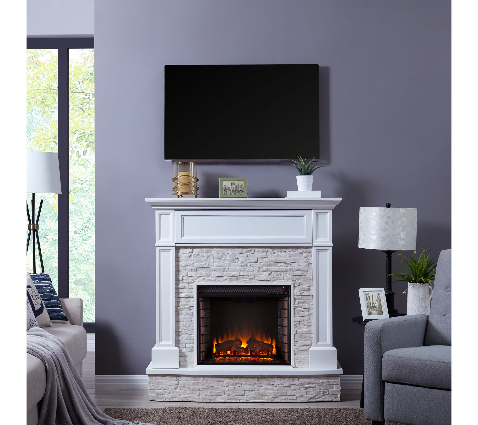 Transform your living room into a cozy haven with this electric faux stone media fireplace. Designed to add style and warmth to your space, it features hidden storage for media essentials and lifelike flames that create a comforting ambiance -- whether you use the heat function or just the glow. Graceful woodwork and stacked faux stone complement modern entertainment setups, making every night in feel special. From SEI.