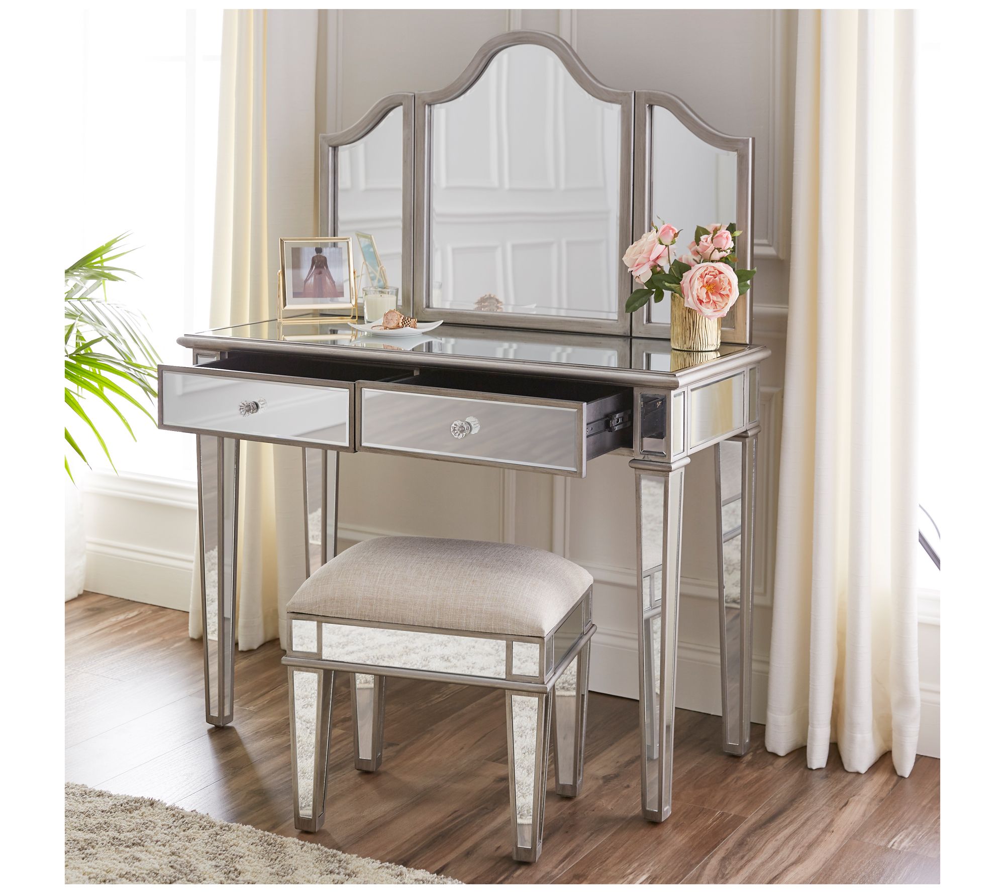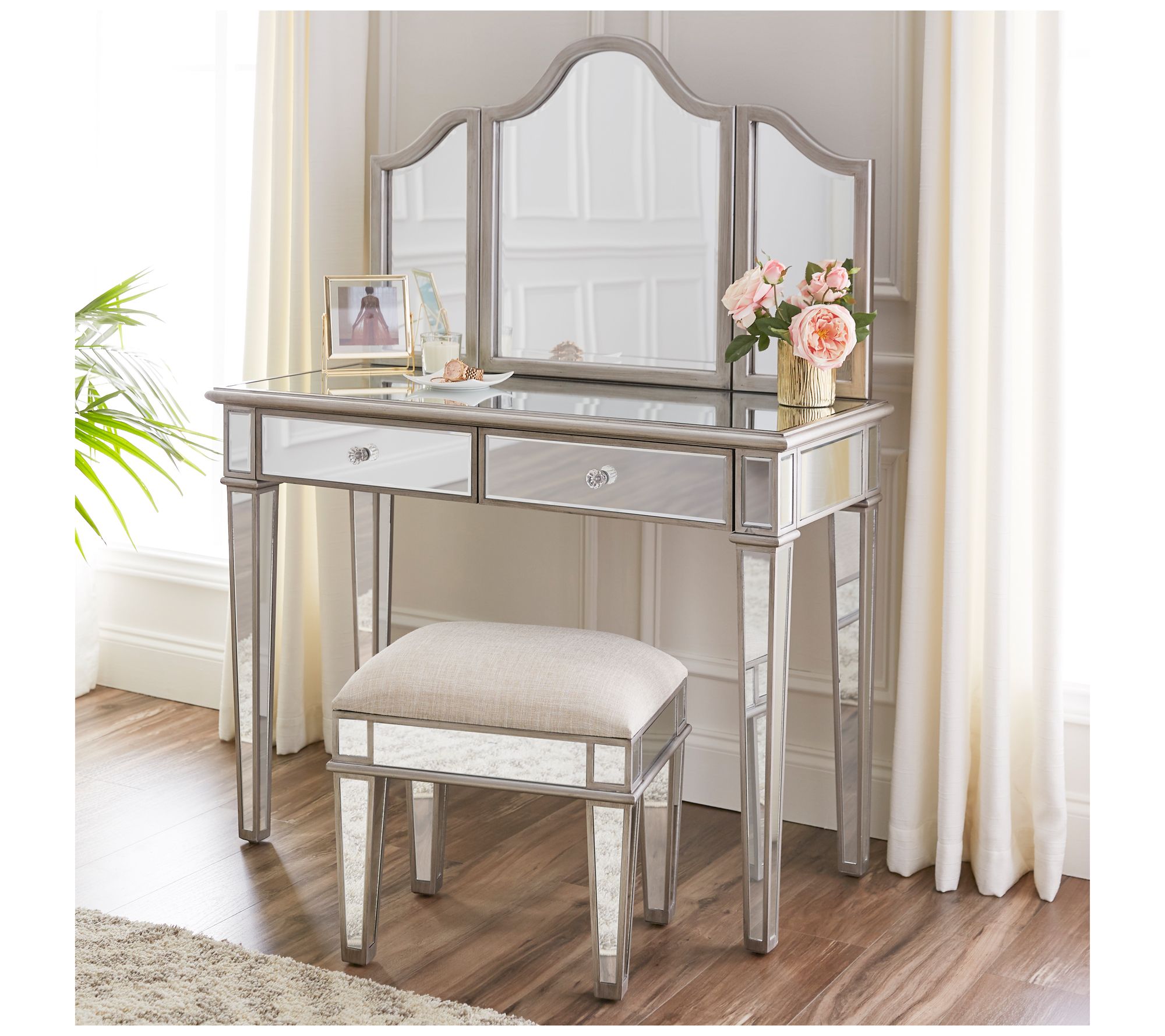 Add a touch of glam to your daily routine with this chic mirrored vanity set. The spacious tabletop and arched mirror offer the perfect setup for prepping for the day, while two mirrored drawers provide ample storage for makeup and accessories. Ideal for small spaces or as a complement to your bathroom or master suite, this set seamlessly integrates into your design. From SEI.