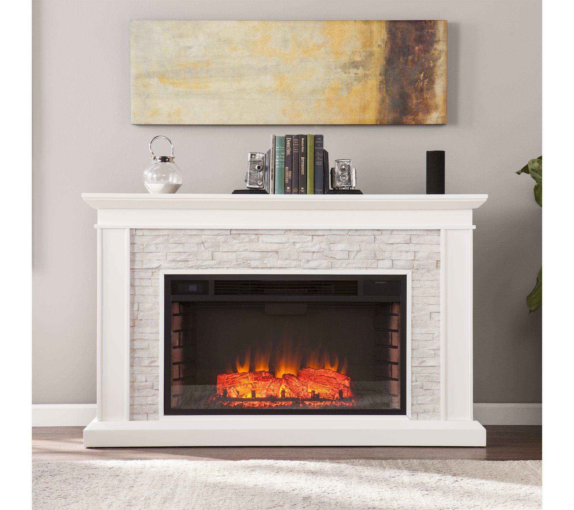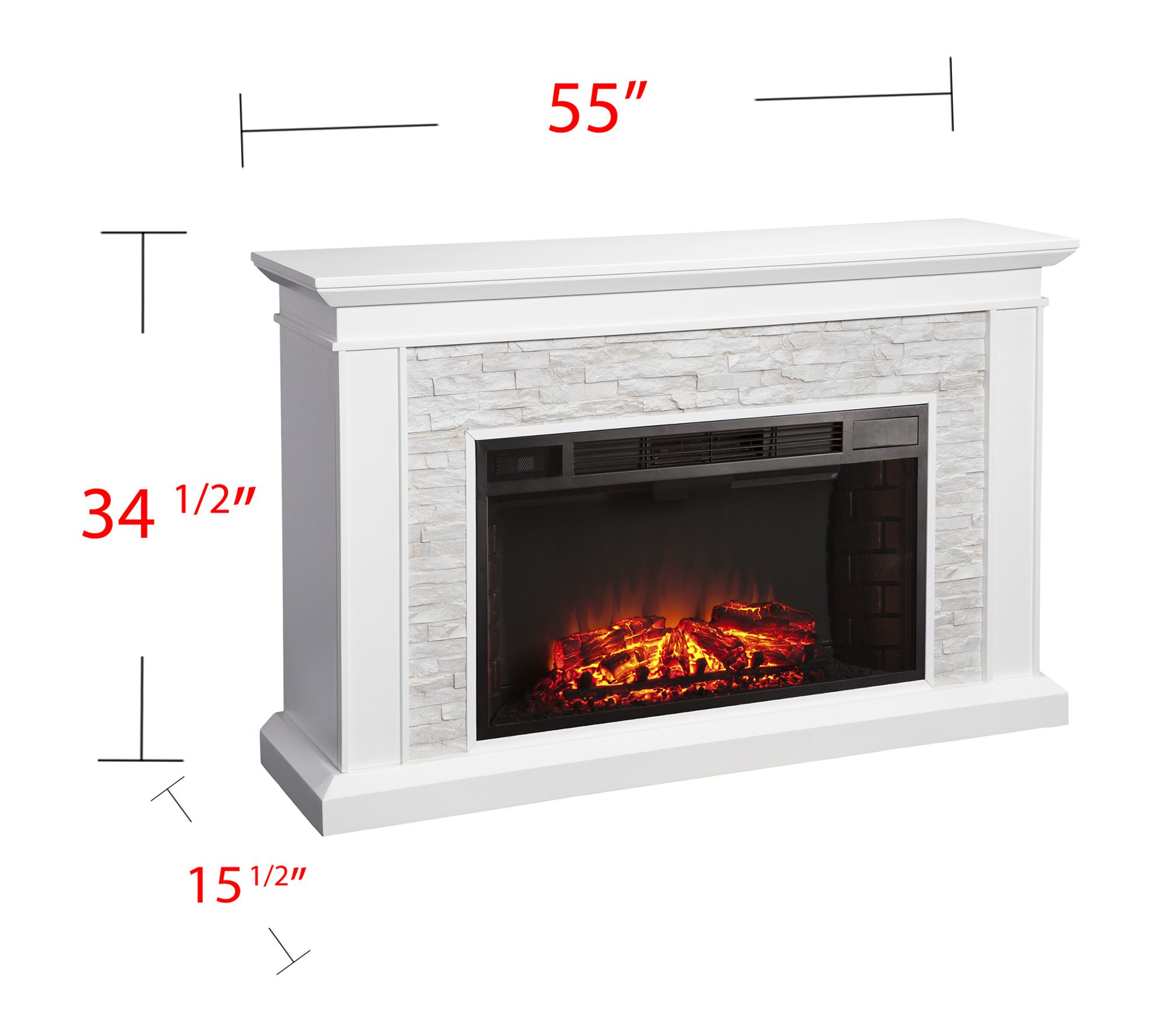 Warm up your evenings with this electric fireplace -- where stacked faux stone creates a rustic touch while crisp woodwork in a painted finish offers timeless elegance. Flickering LED flames and a remote-controlled heater fill rooms up to 400 sq ft with ambiance and cozy comfort, ideal for movie nights or casual gatherings. From SEI.