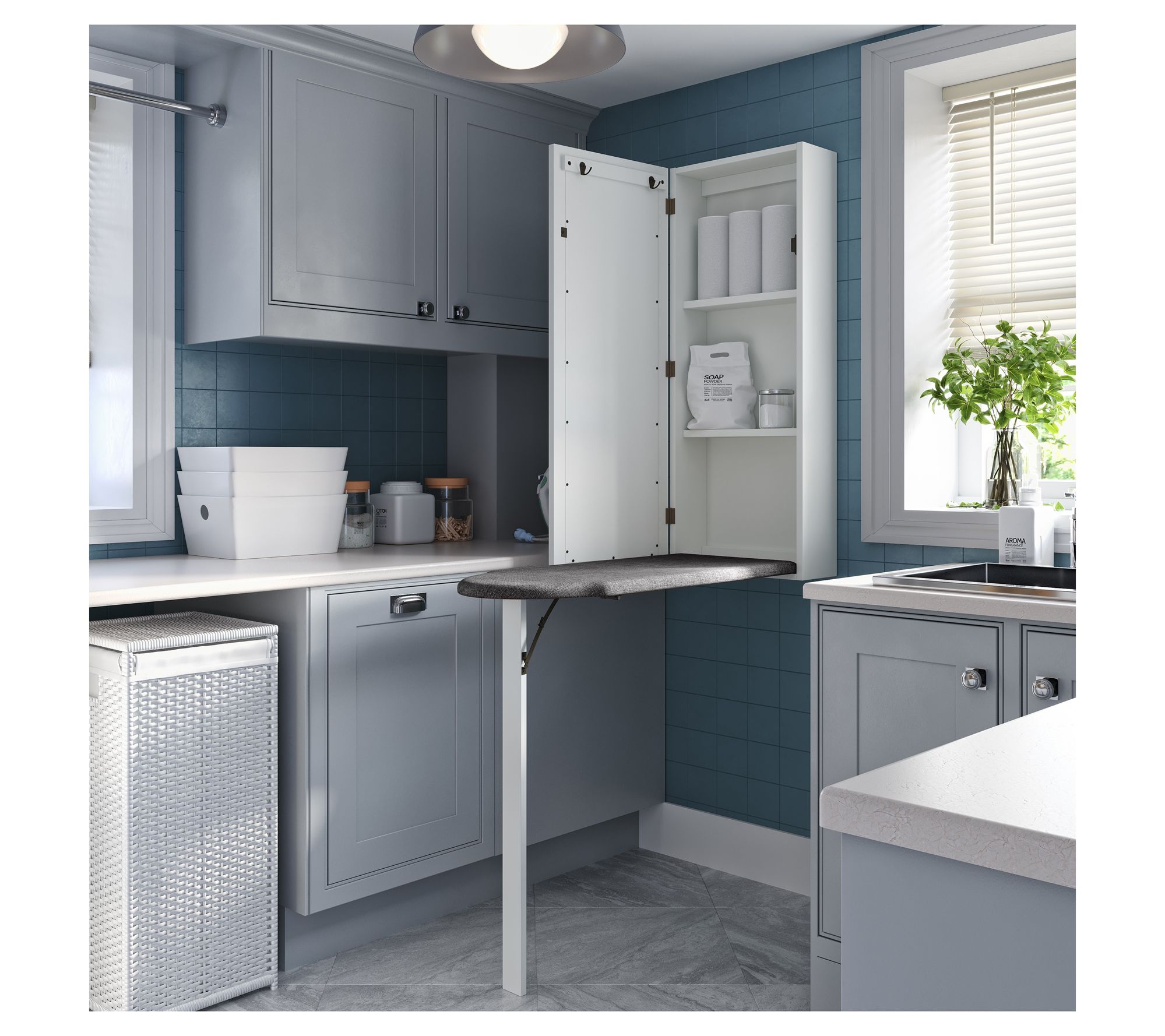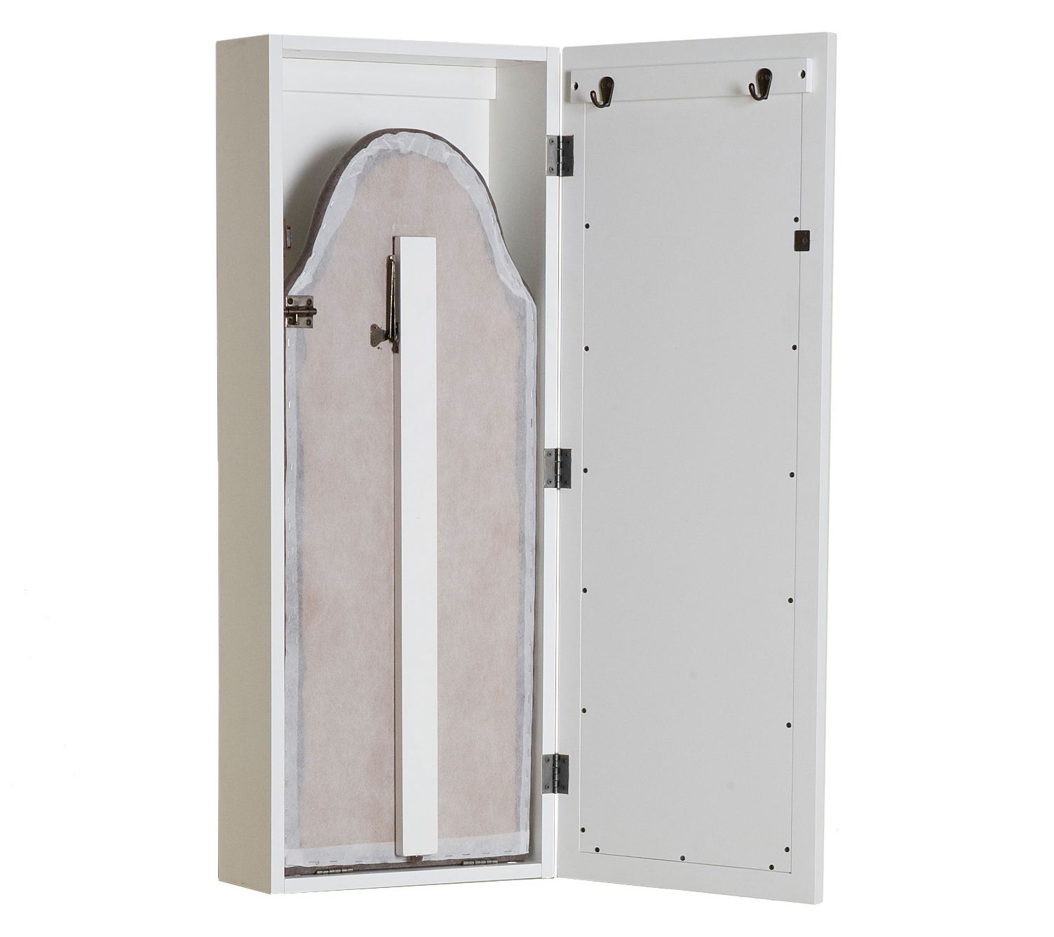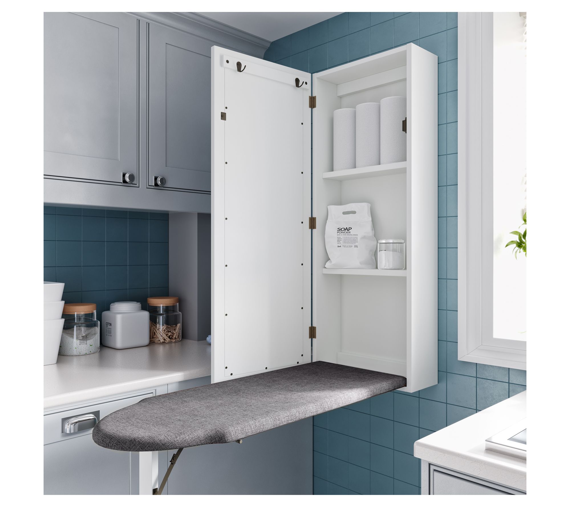 Tackle laundry day with ease using this wall-mounted ironing board, designed to maximize space while keeping clothes looking crisp. Fold out the board and organize supplies on convenient shelves, then use the built-in hooks and exterior mirror to streamline your routine from start to finish. From SEI.
