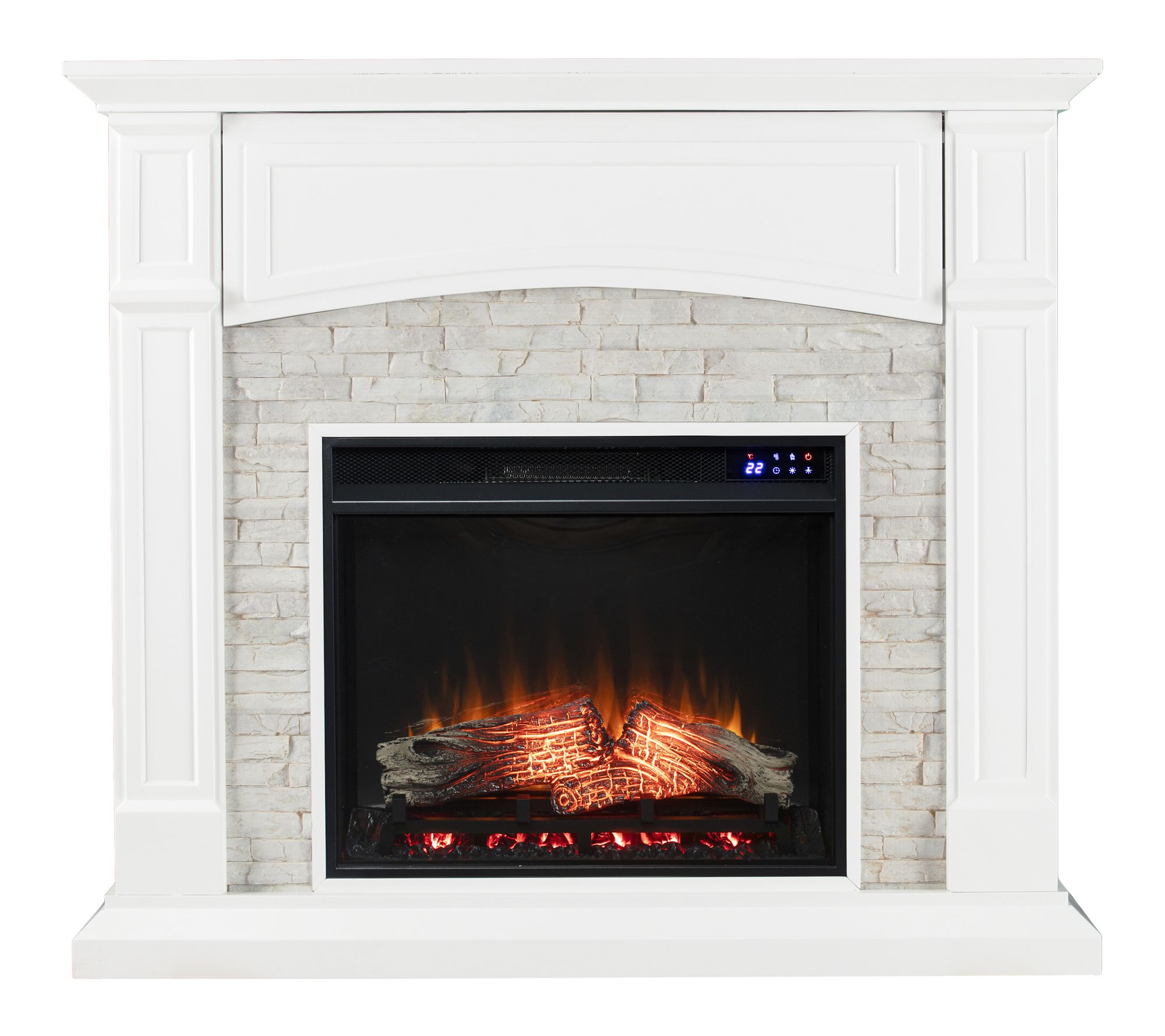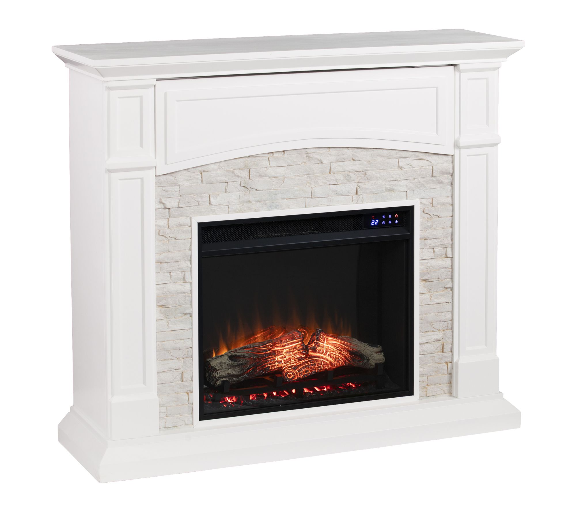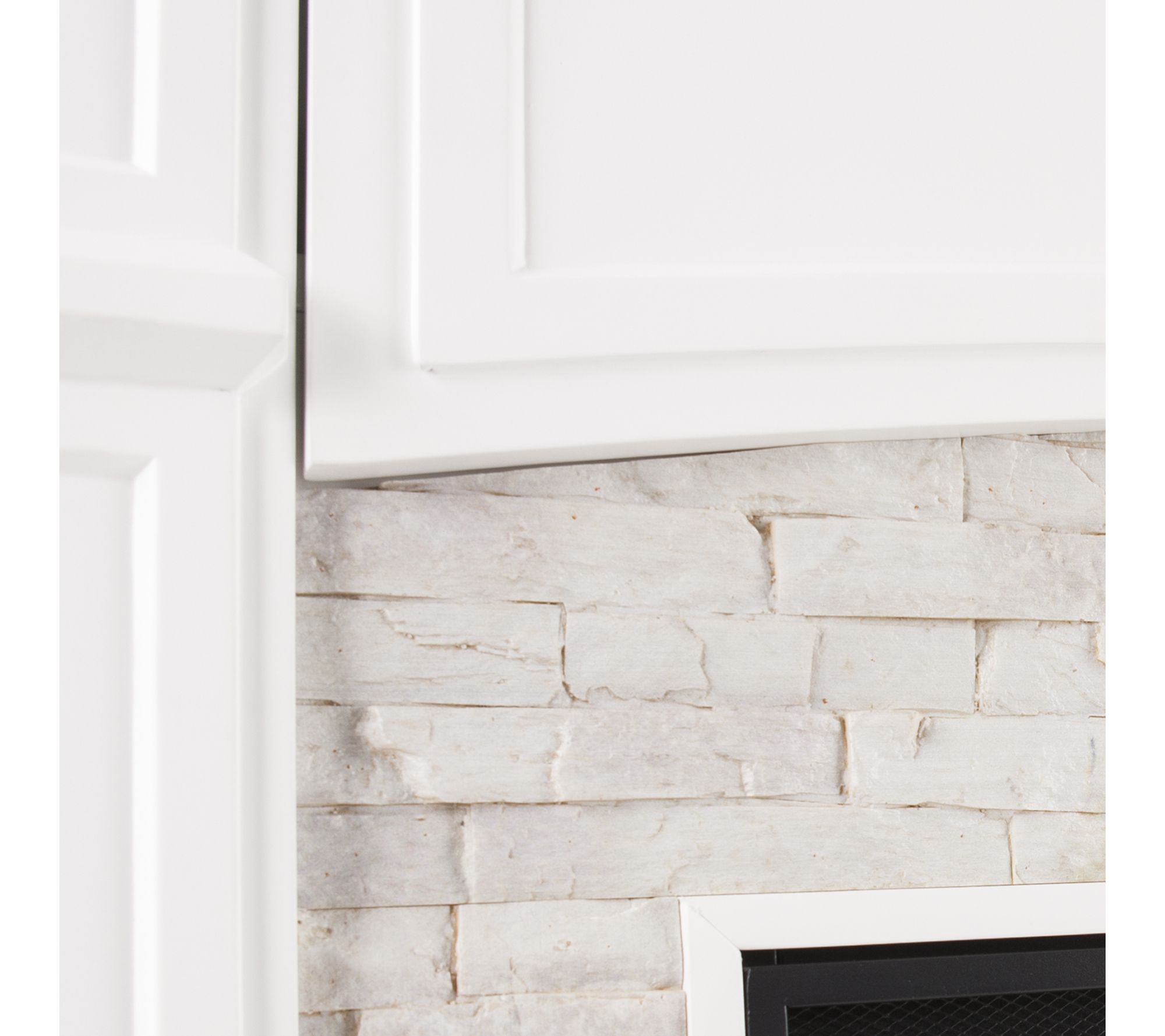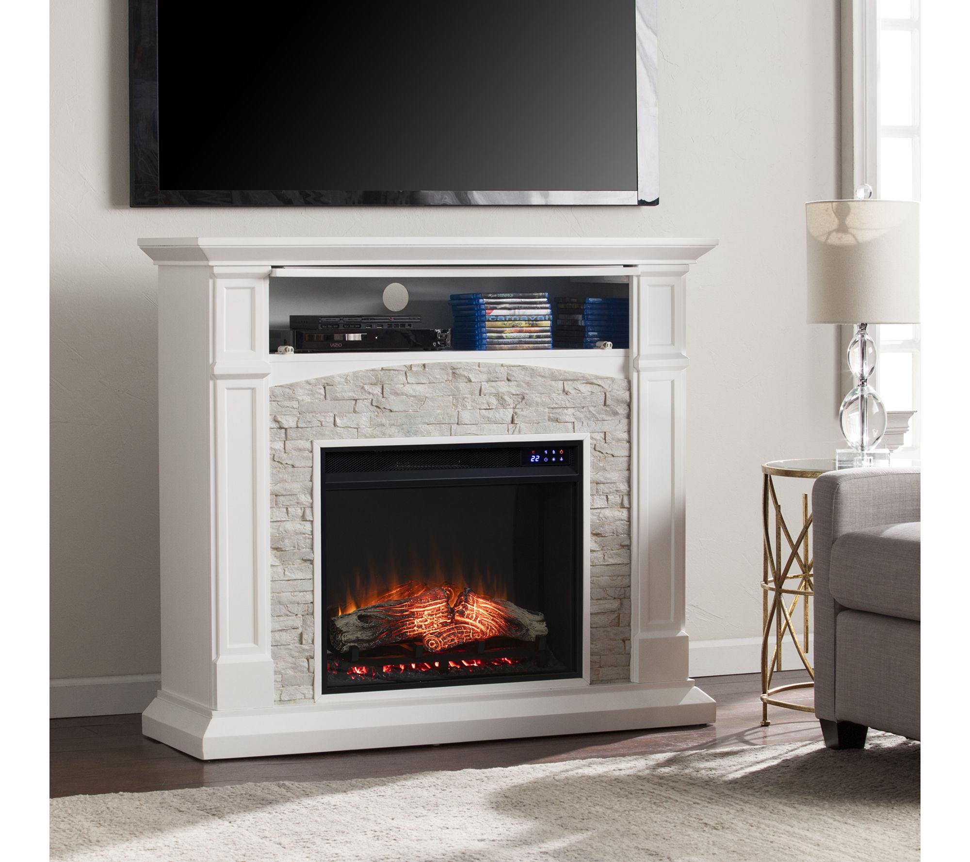 Transform your living space with the warmth and charm of this electric touch screen media fireplace. Soft LED flames and realistic embers set a cozy mood whether you're watching TV or hosting friends, while the faux stone surround and crisp painted finish add farmhouse chic appeal. Store electronics neatly in the flip-up media shelf and enjoy heat or ambience any time. From SEI.