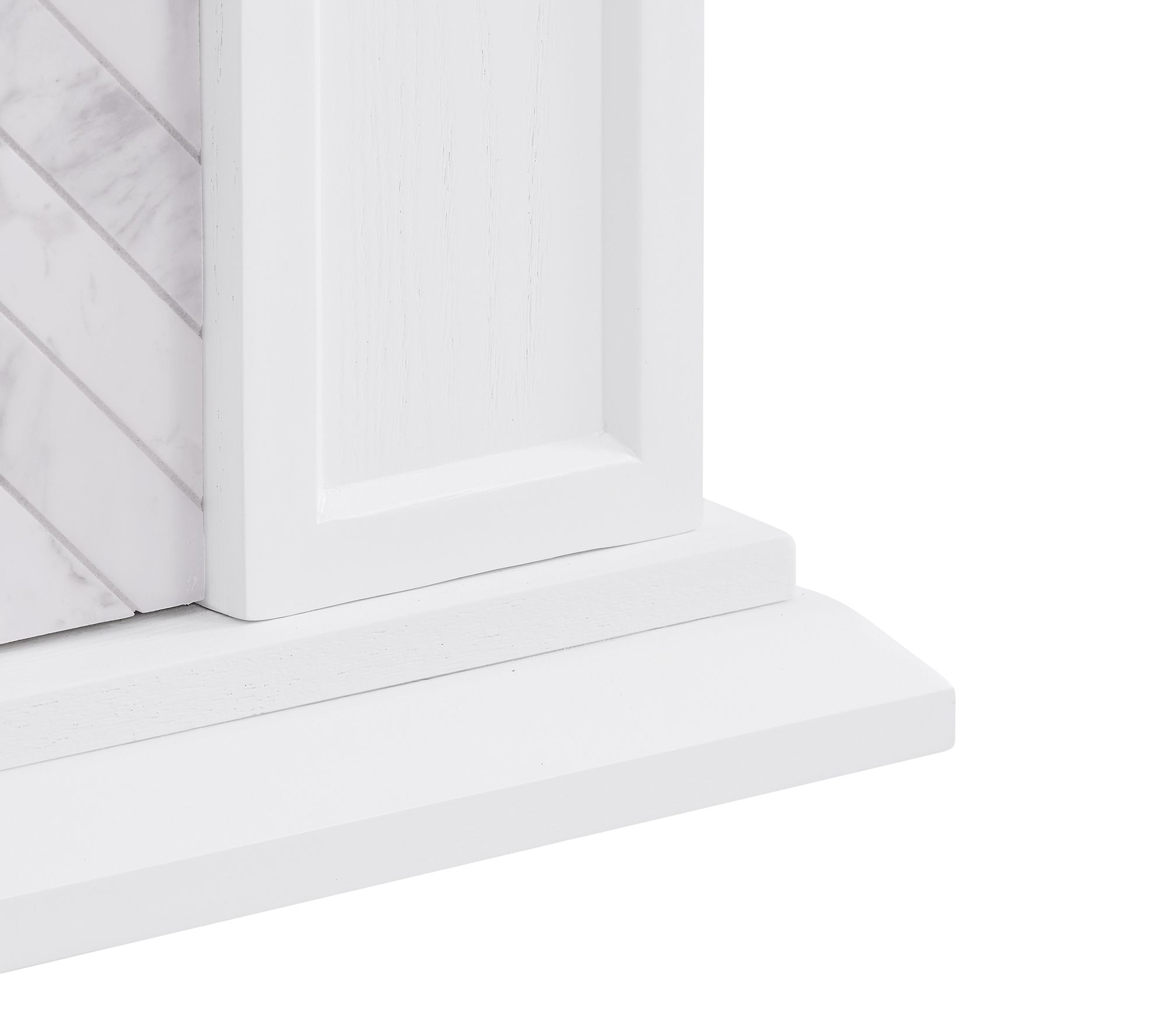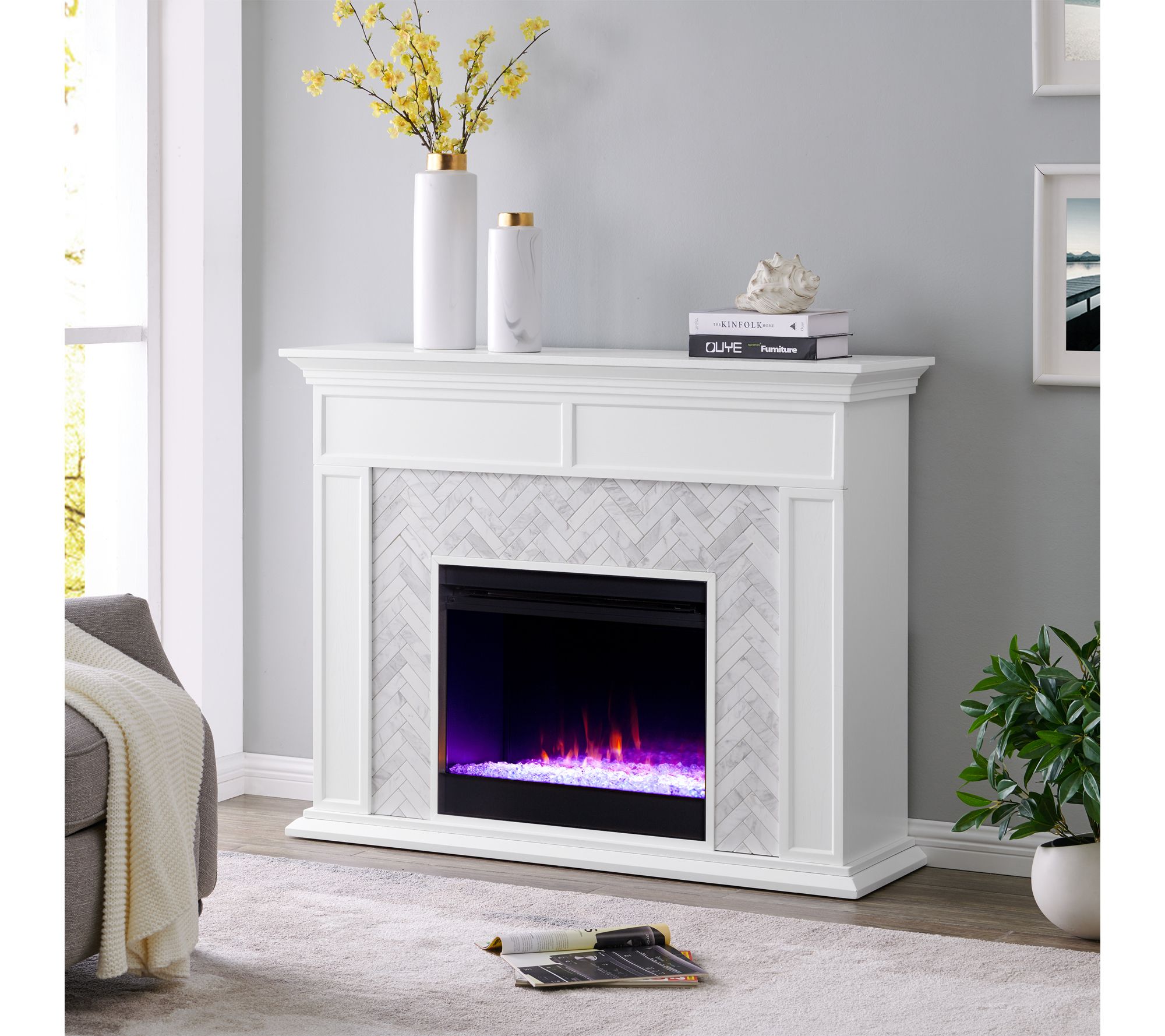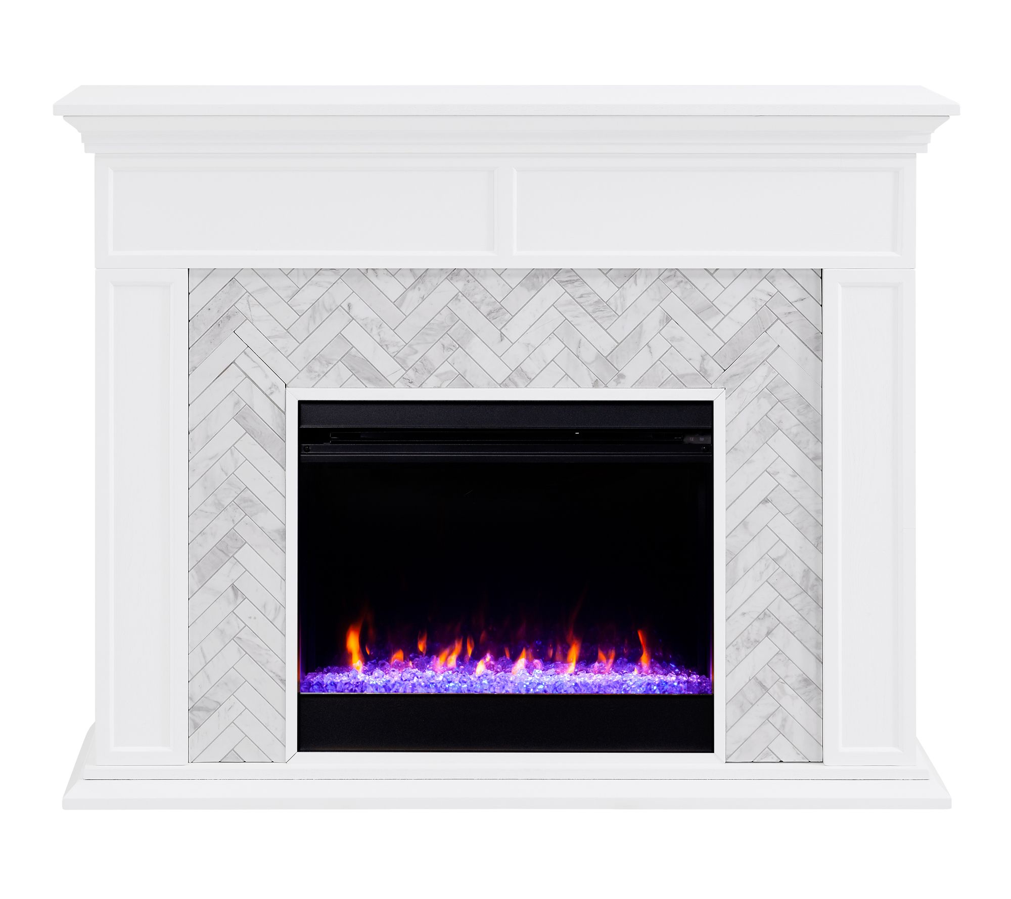 Create warmth and ambiance in your home with this freestanding electric fireplace. White marble and herringbone-patterned tile bring a refined touch to any living space, while flickering LED flames and shimmering faux crystal fill your evenings with cozy, colorful charm -- all easily controlled from the comfort of your sofa. From SEI.