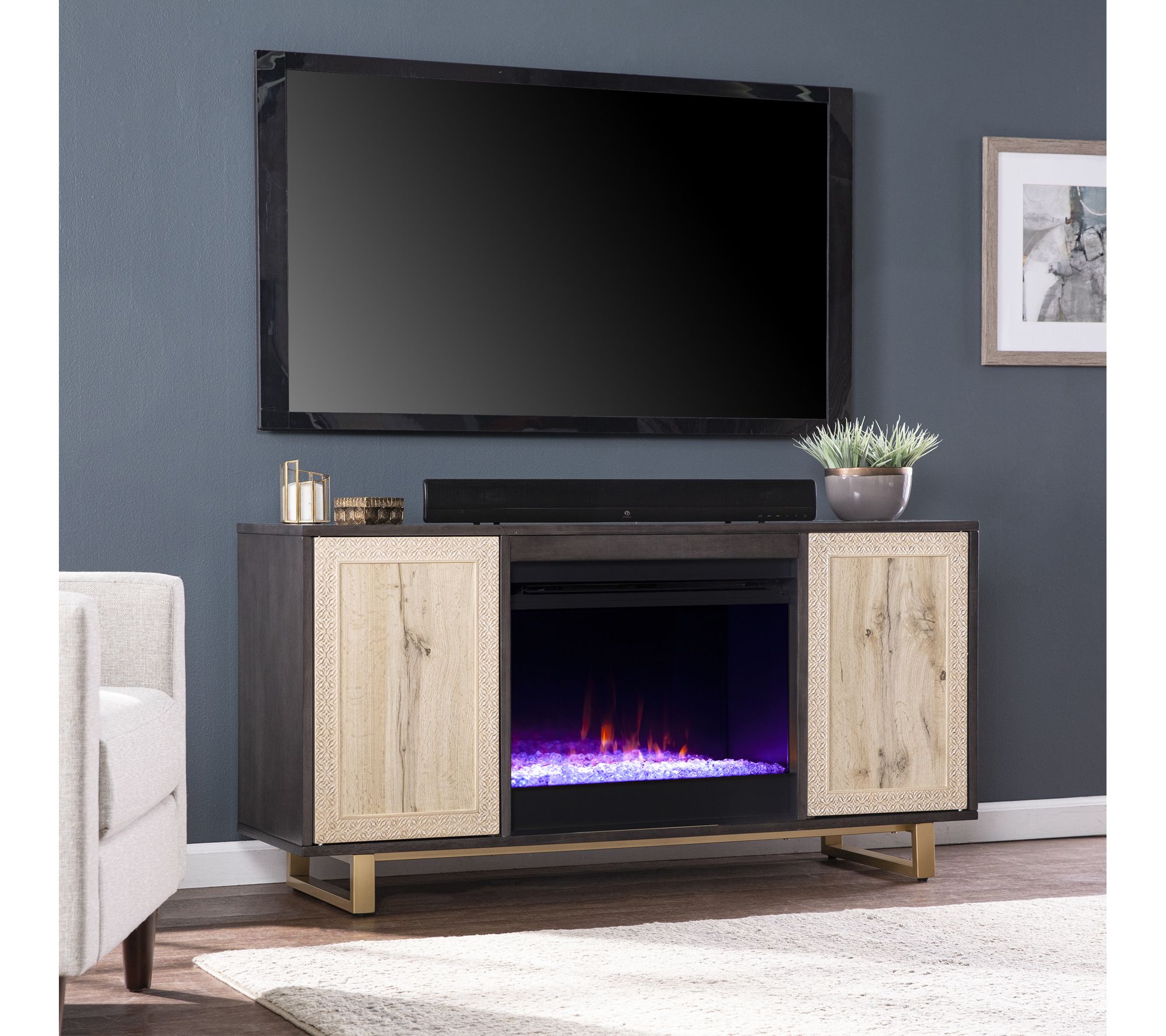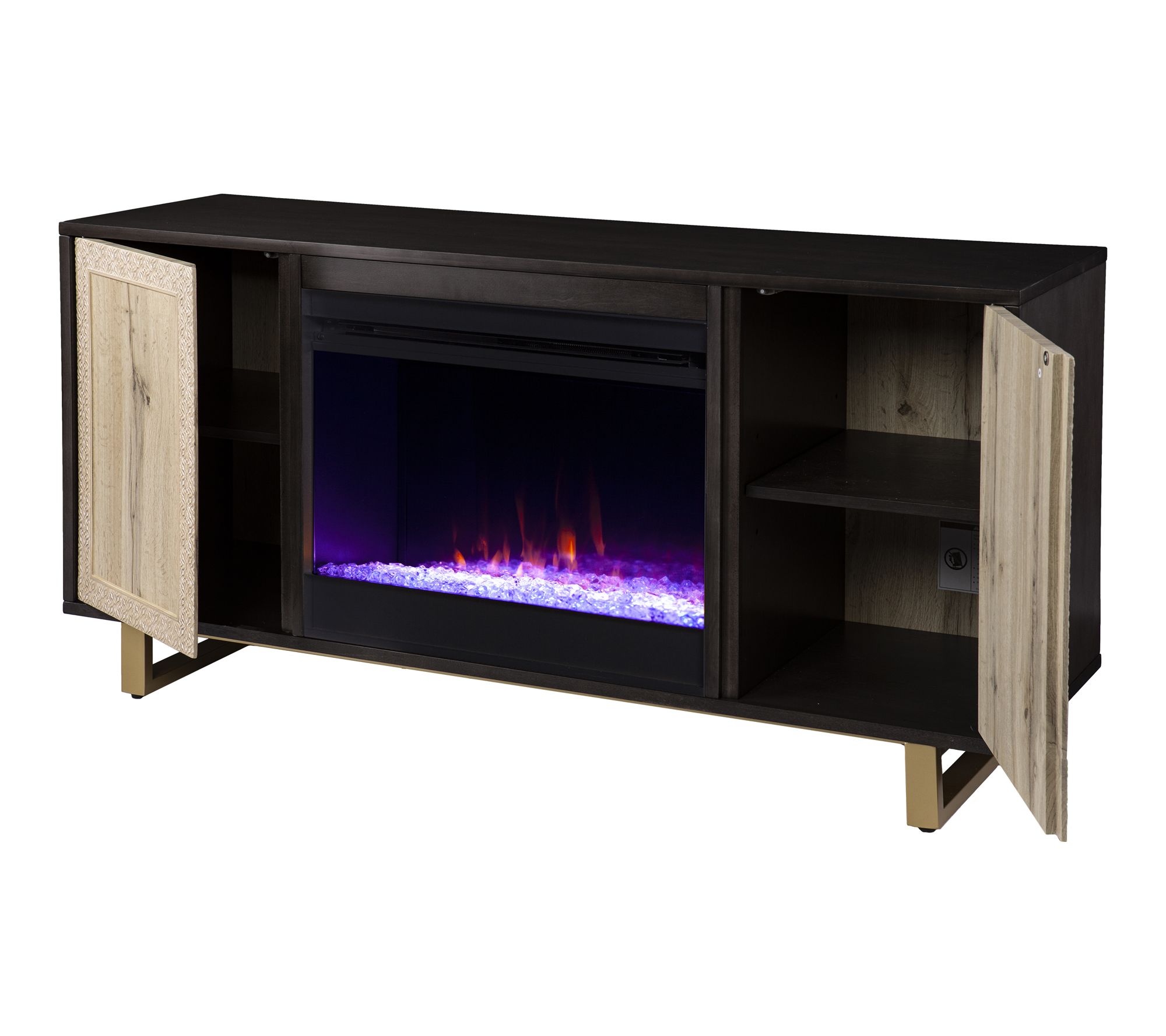Movie nights become a cozy retreat with this electric fireplace, crafted with a dark wood finish and detailed cabinet doors for a classic touch. Flickering LED flames and alternating colors set a soothing ambiance, while adjustable shelves manage everything from your favorite films to collectibles -- right at your fingertips. Relax as supplemental heat fills rooms up to 400 square feet, all from the comfort of your sofa. From SEI.