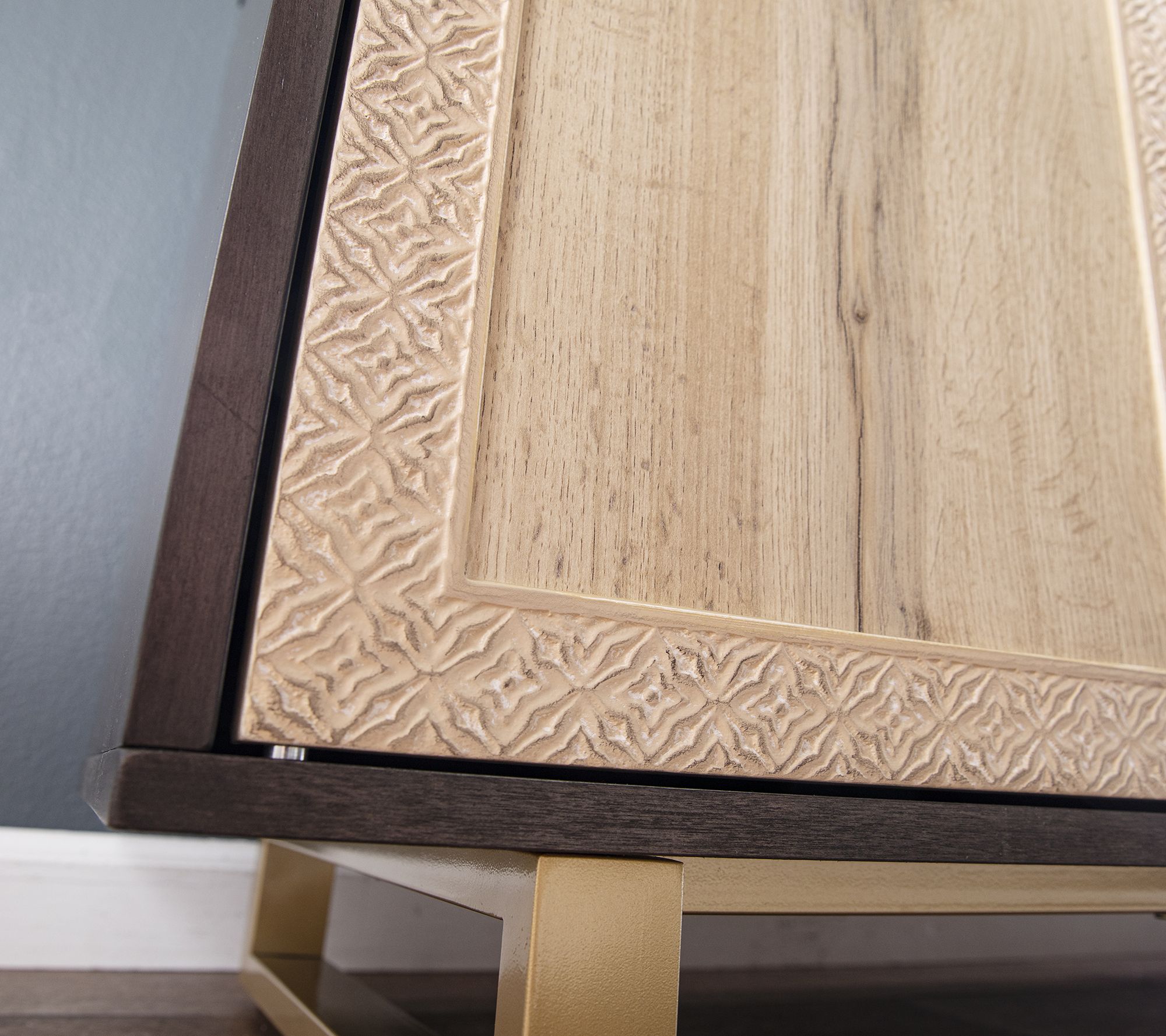 Cabinet doors feature carved details