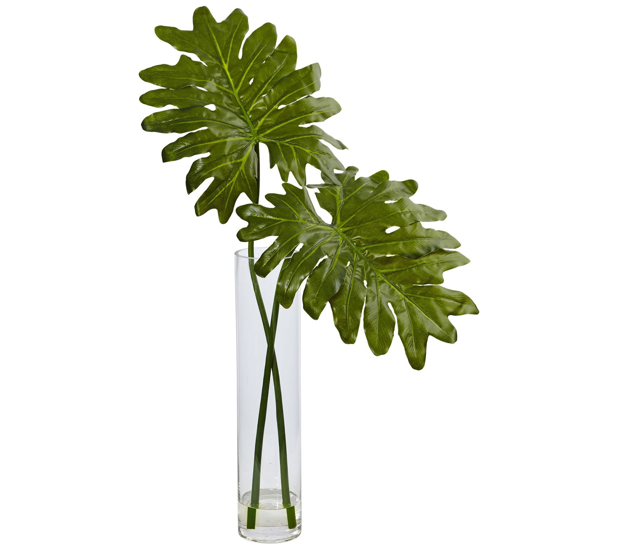 Lush tropics with modern flair for your home or office. Two large, green Selloum leaves balance on delicate stalks in a cylindrical glass vase. The bottom of the vase has a small amount of faux water, making this a sleek and lifelike arrangement. From Nearly Natural.