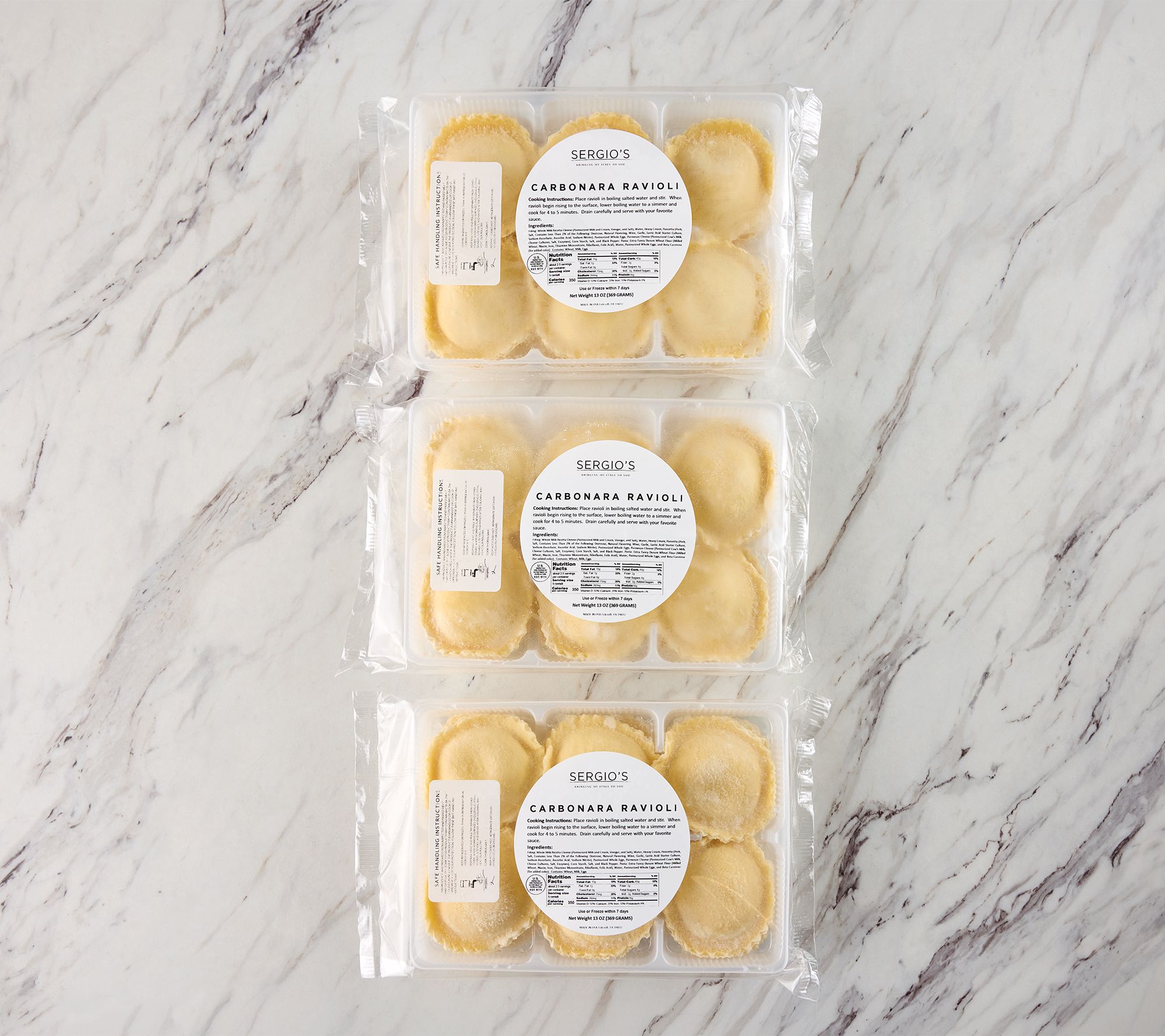 • Includes three 12-count trays of Carbonara and Ricotta ravioli