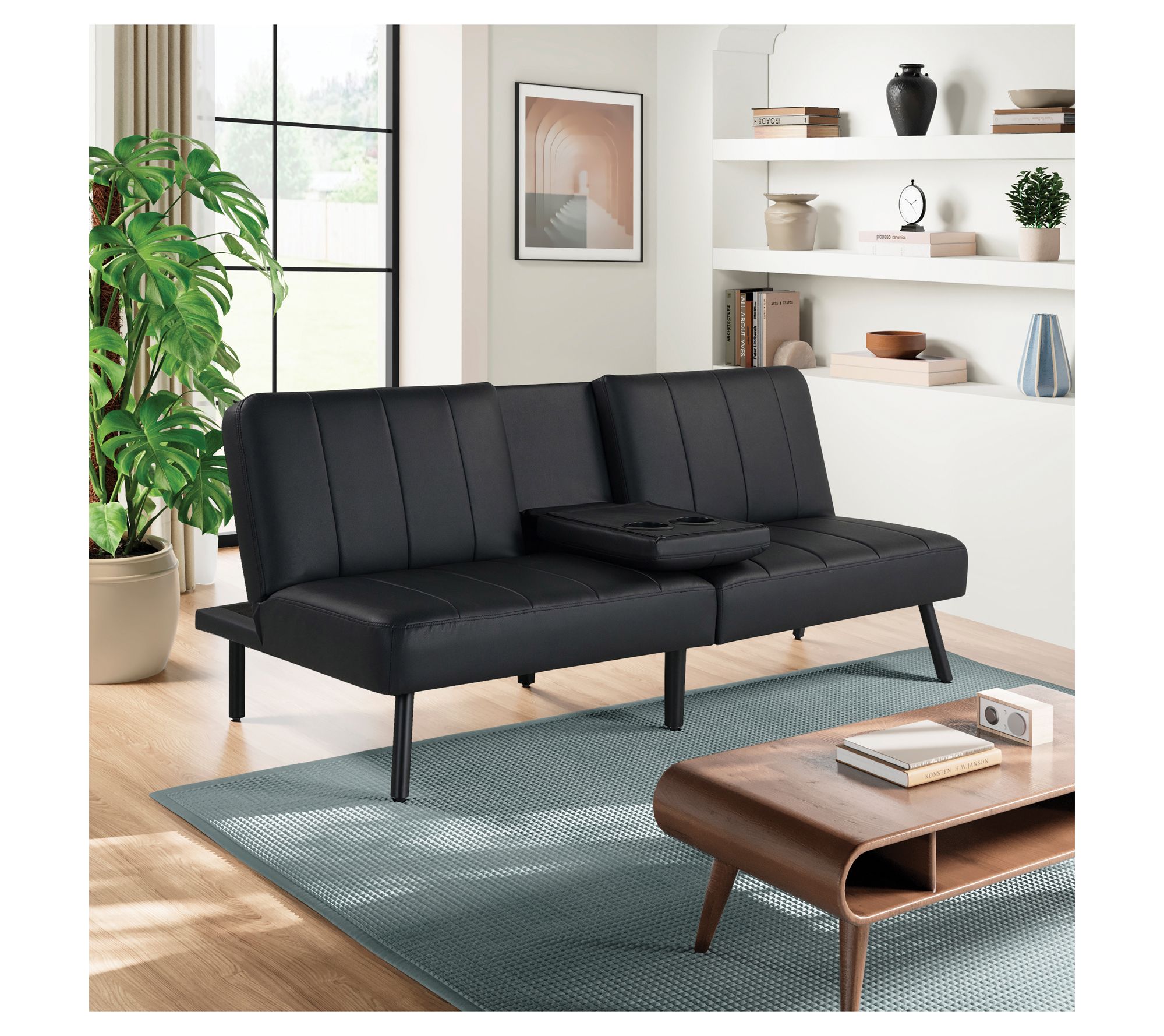 Movie marathons are better when you're settled onto cushions that feel as plush as they look, and this convertible sleeper makes it easy to switch from lounging to an impromptu overnight stay. Deep tufting, built-in cup holders, and supportive Dream Coils bring comfort and convenience to any room, all grounded by sleek metal legs and a sturdy hardwood frame. From Serta.