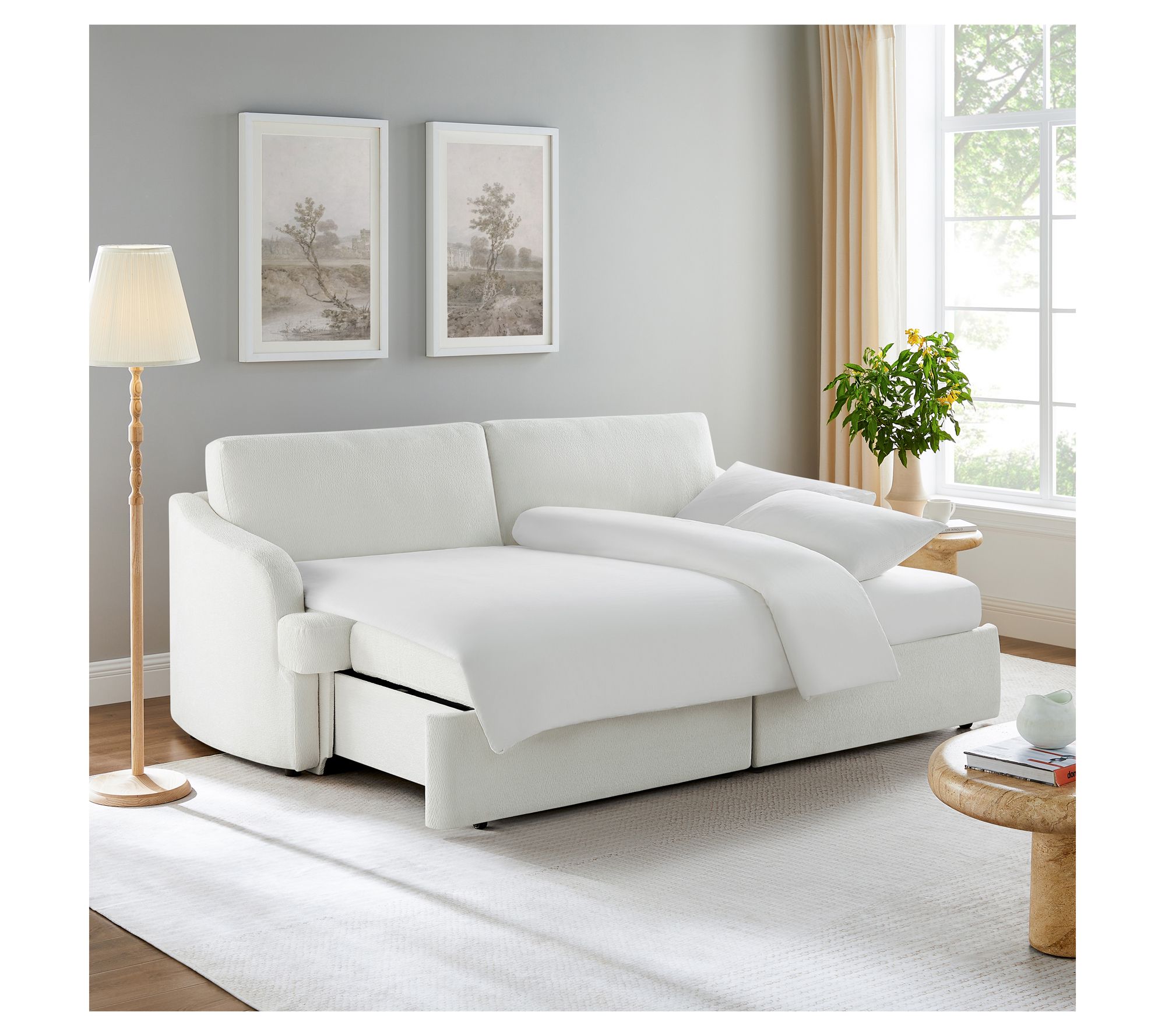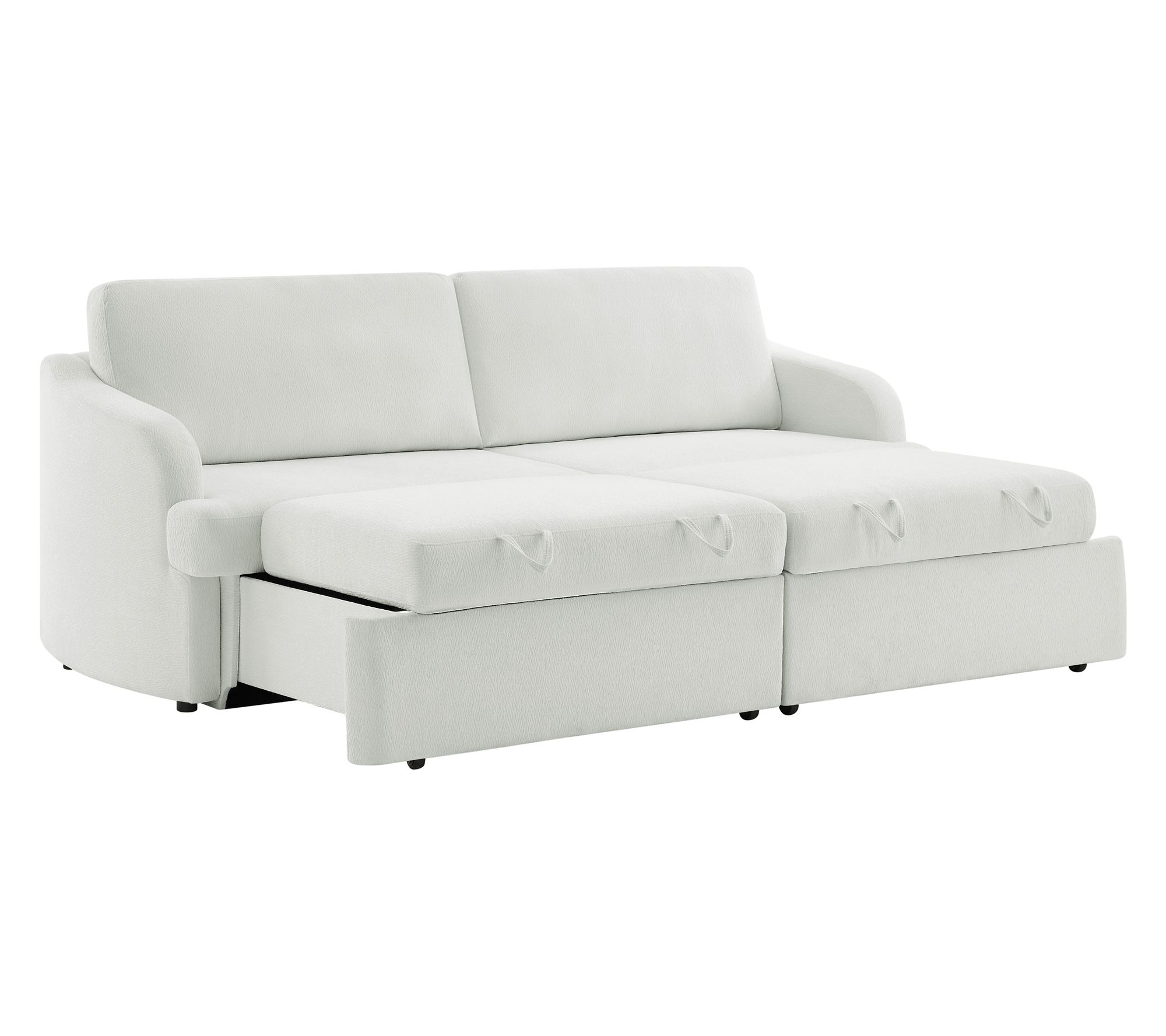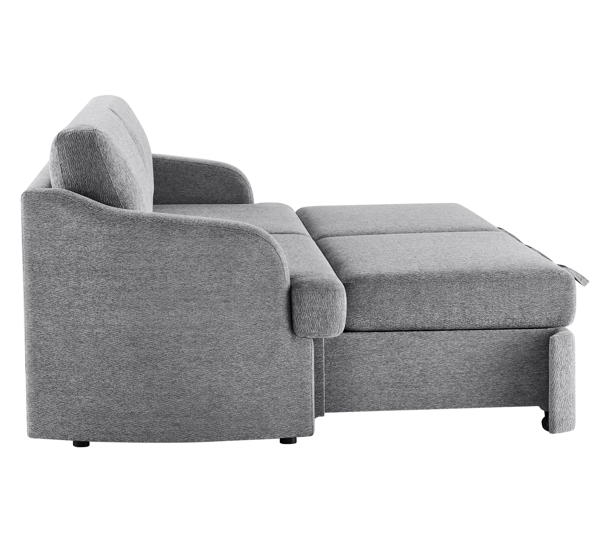Movie marathons, weekend naps, or hosting overnight guests -- this convertible sleeper adapts to it all with ease. Its trundle mechanism transforms from classic sofa to chaise or a roomy sleep space in seconds, while plush cushioning gives a supportive yet cozy feel. The woven upholstery and solid wood legs bring a stylish touch to any living room. From Serta.