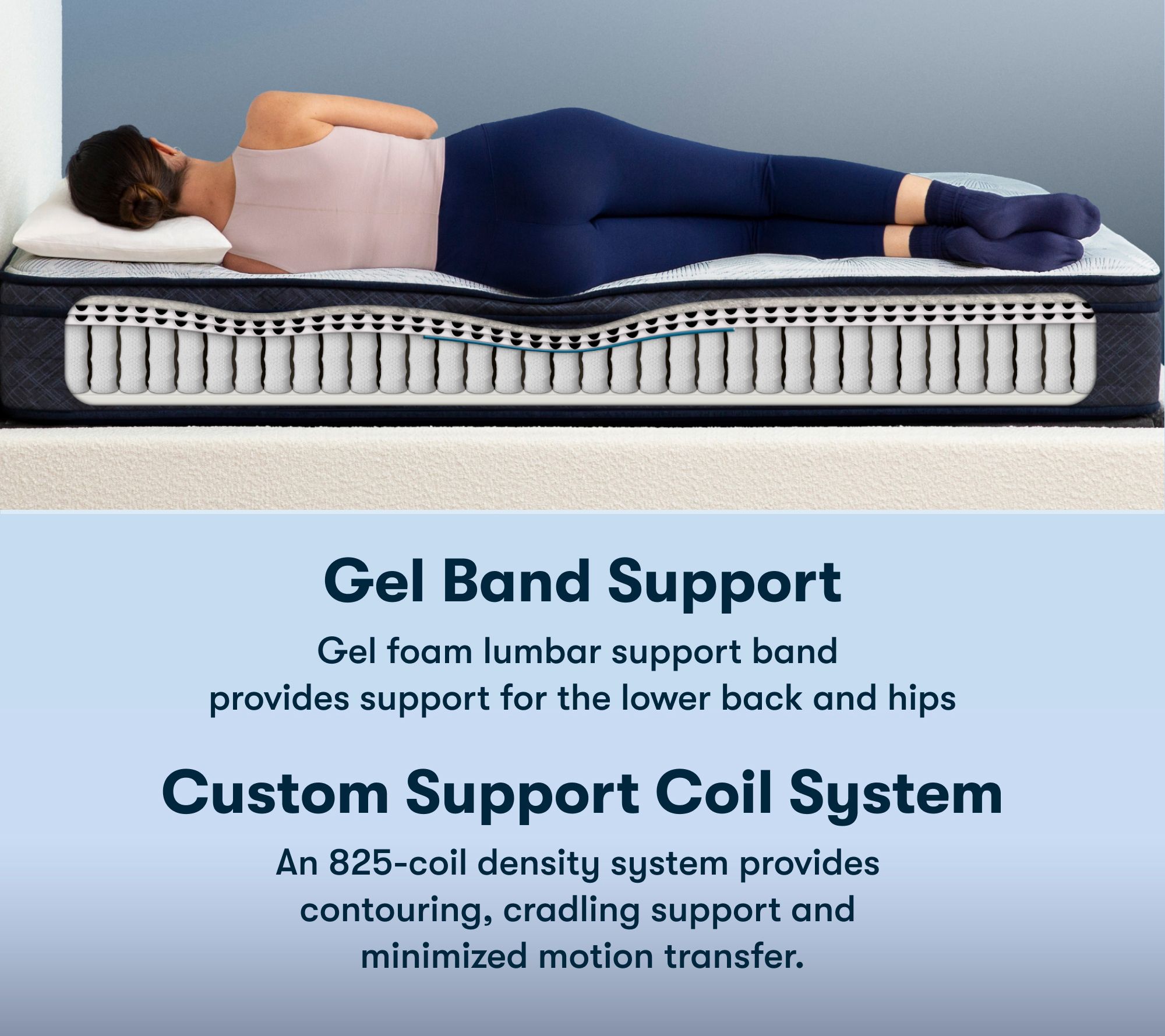 One-sided, six-layer design with 1" fiber base layer, 1" PillowSoftAire, 0.5" support foam, 0.655" gel band support, 8" Custom Support 1125-coil system, and 1" balanced support pad