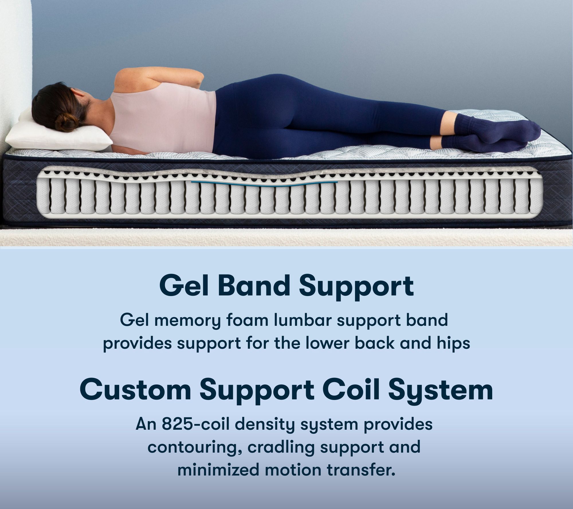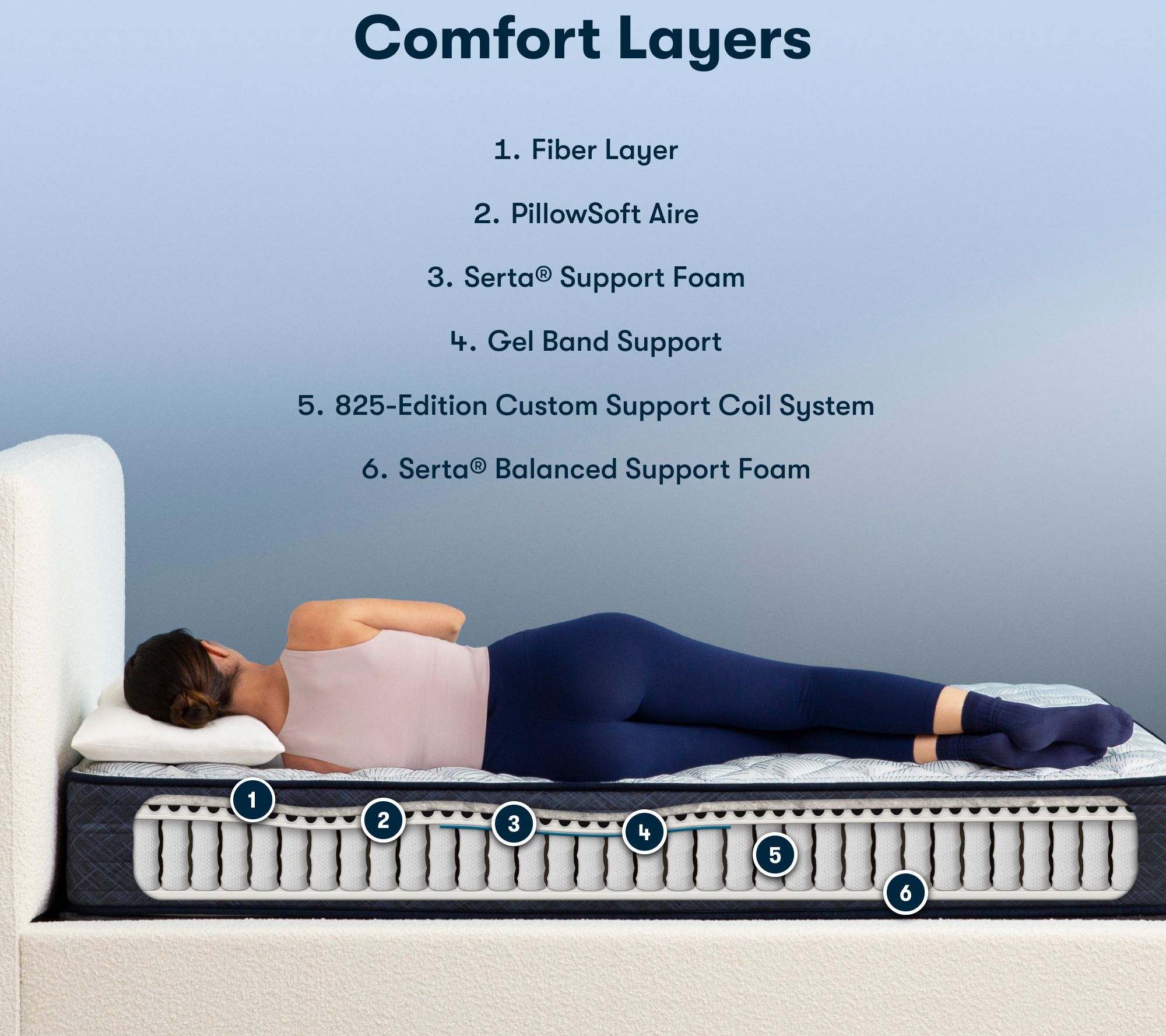 One-sided, six-layer design with 1" fiber base layer, 1" PillowSoftAire, 0.5" support foam, 0.375" gel band support, 8" Custom Support 1125-coil system, and 1" balanced support pad