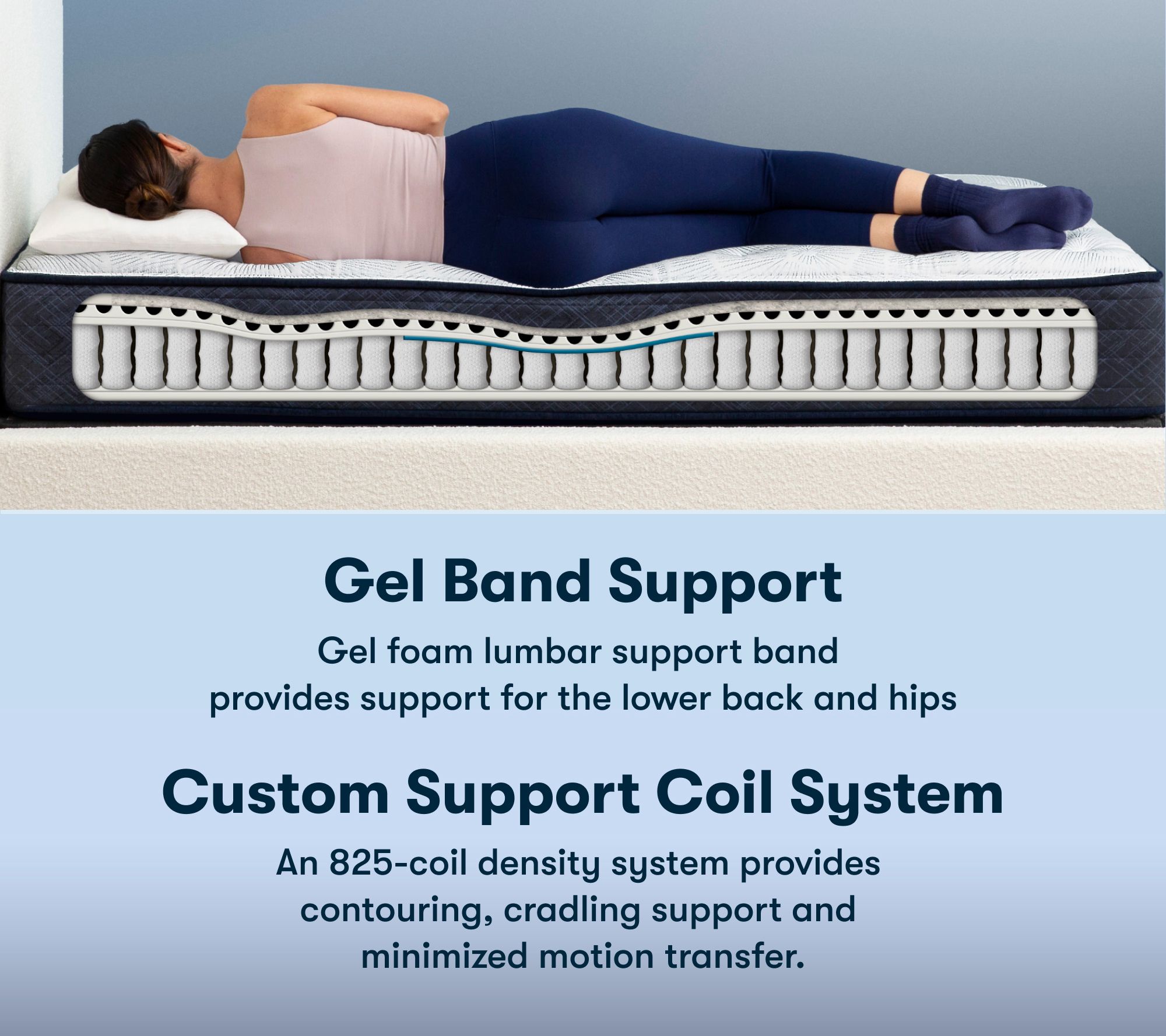 One-sided, six-layer design with 1" fiber base layer, 1" PillowSoftAire, 0.5" support foam, 0.375" gel band support, 8" Custom Support 1125-coil system, and 1" balanced support pad