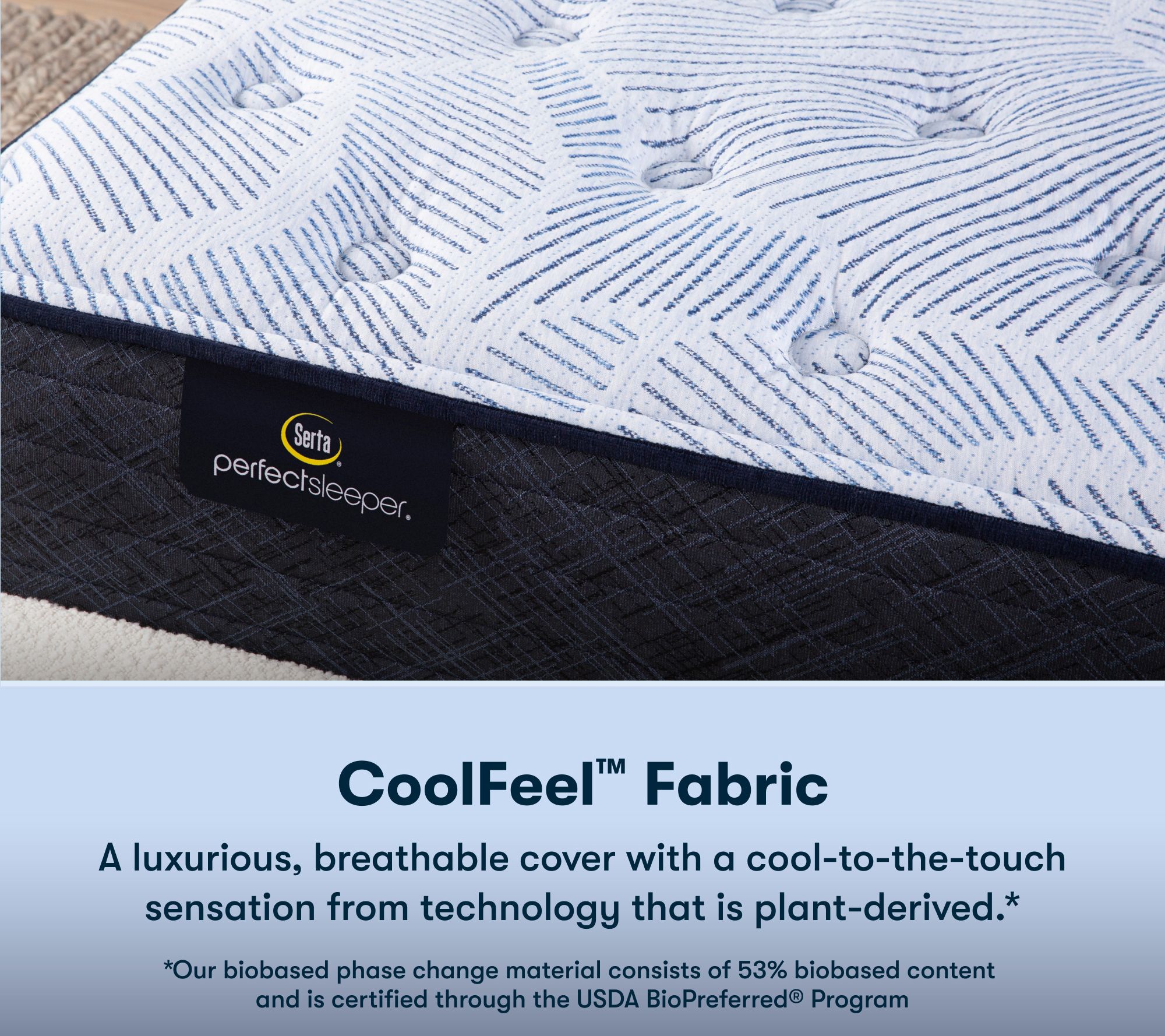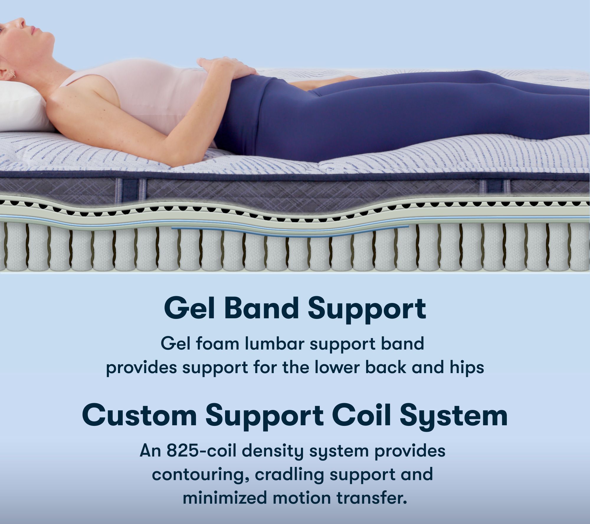 One-sided, eight-layer design with PerfectPure fiber, PillowSoftAire, Cool Twist gel memory foam, cushion quilt foam, gel band support, Custom Support 655-coil system, and balanced support pad
