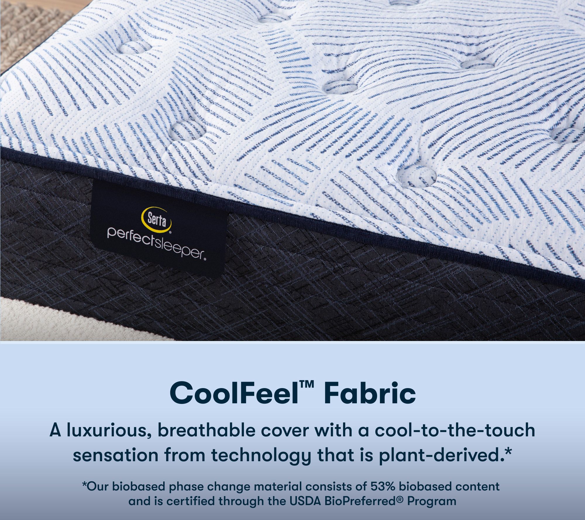 One-sided, eight-layer design with PerfectPure fiber, PillowSoftAire, Cool Twist gel memory foam, cushion quilt foam, gel band support, Custom Support 825-coil system, and balanced support pad