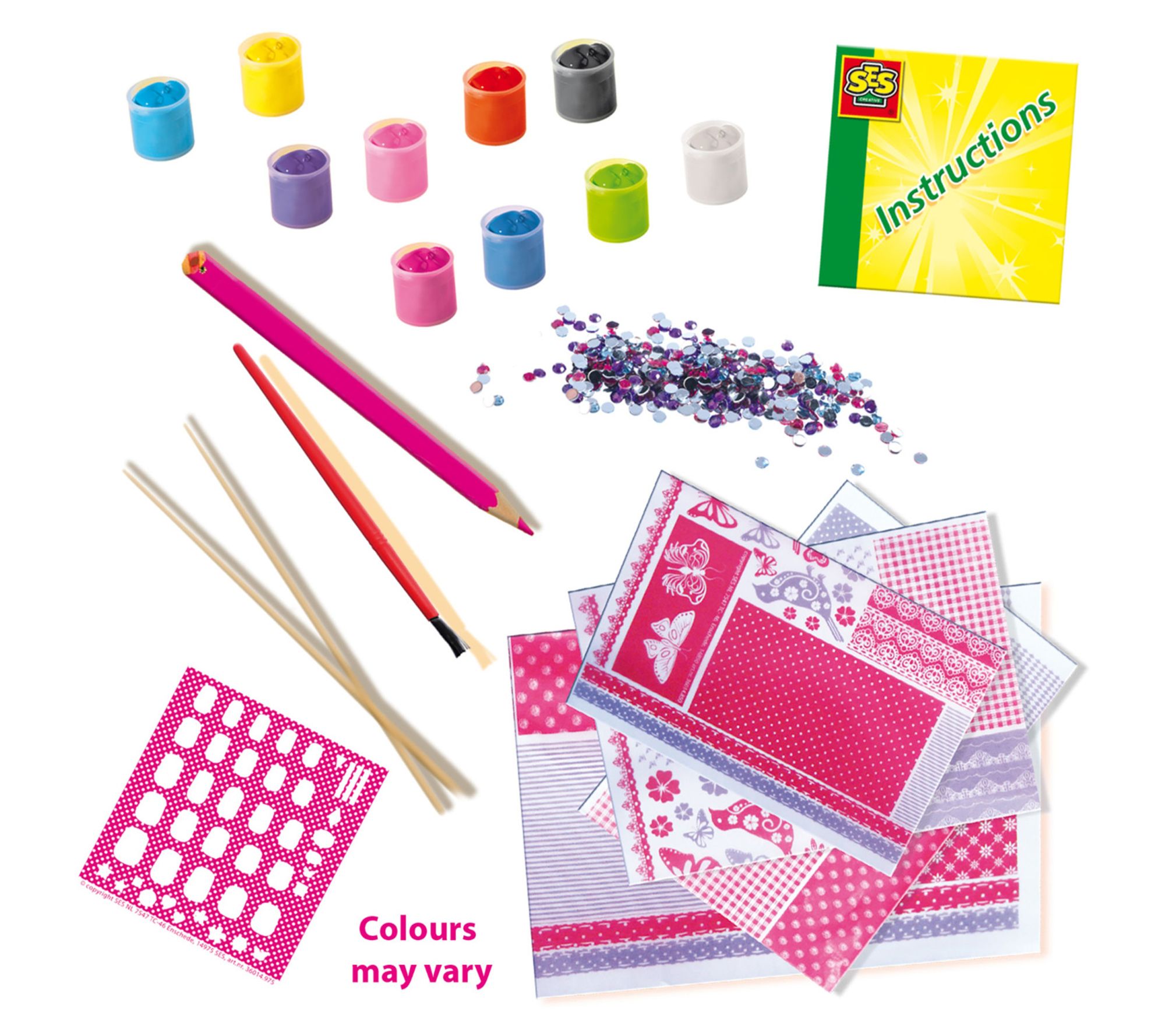 • Includes 10 nail, gems, 12 paints, 2 paint brushes, two wooden sticks, pencil, sheet of Stickers, and four wraps