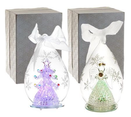 Whether you give them as a gift or keep them for yourself, these beautiful, handblown glass Christmas ornaments are sure to be a holiday highlight. Both the glass spun angel and glass spun tree light up with either white or color-changing lights. A ribbon on top lets you hang them on a tree, or set them on a window sill or shelf using the sparkling white base.