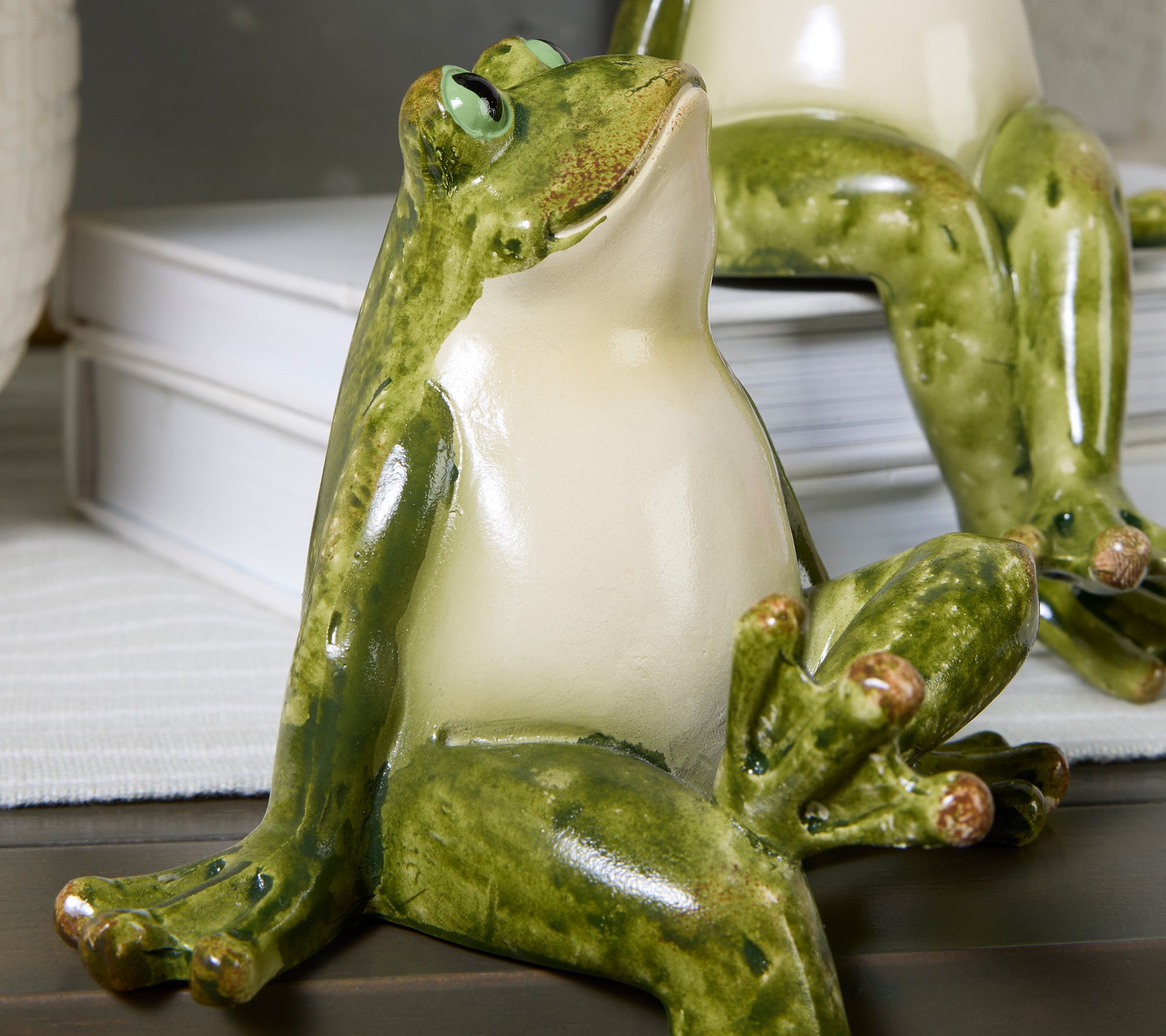 Whether displayed on a bookshelf or perched by your favorite reading spot, this set of frog shelf sitters brings a delightful splash of whimsy to your space. Their relaxed poses and gentle green coloring add charm to any room, sparking smiles whenever you catch their eyes. From the Valerie Parr Hill Collection.