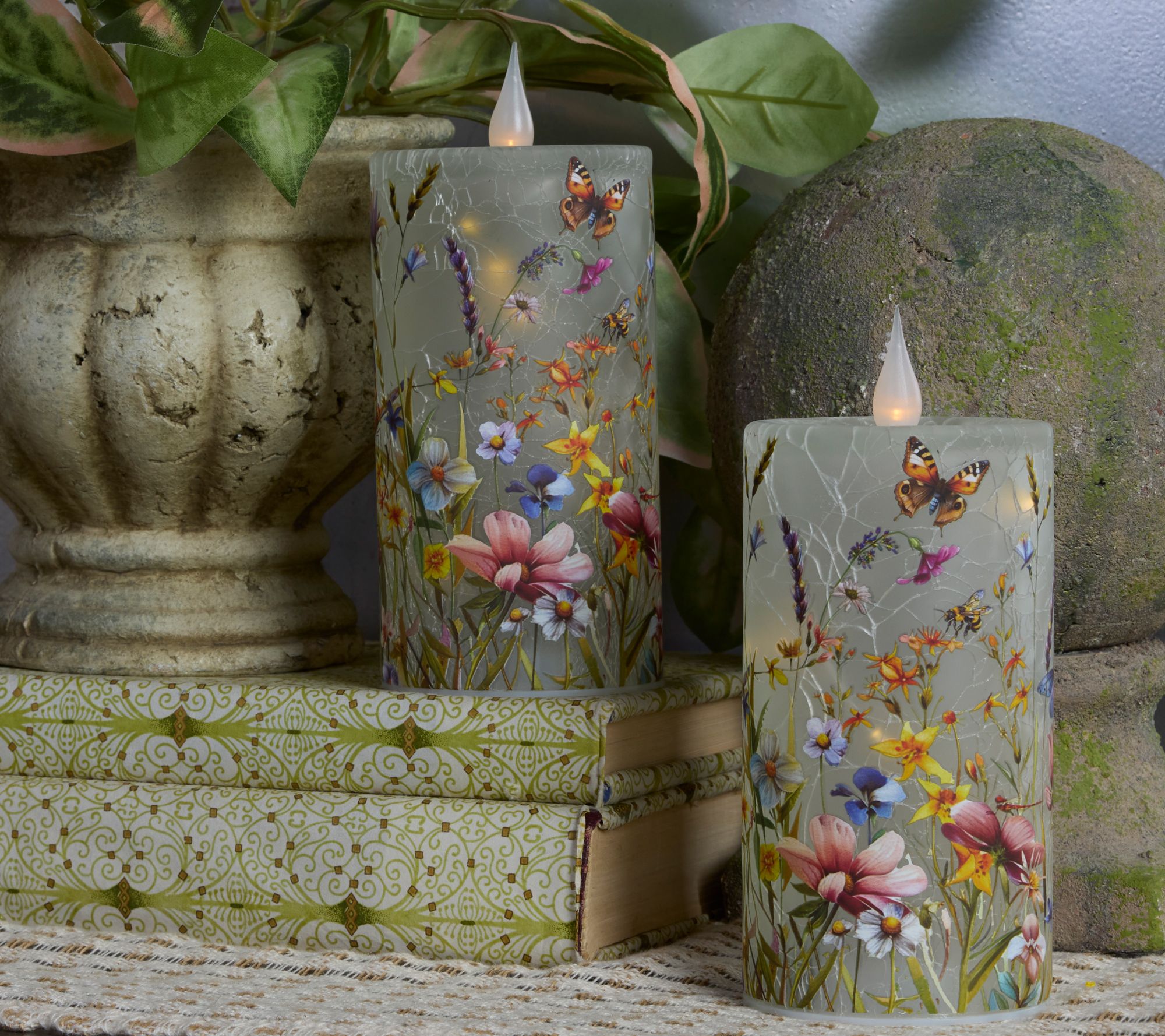 Brighten your evenings with the charm of wildflowers -- this set of two glass flameless candles features vivid blooms wrapped around a crackle finish, casting a cozy ambiance wherever they glow. Each candle offers realistic flickering and interior lights that can twinkle or remain steady, perfect for effortless highlighting of mantels, side tables, or nooks with floral beauty. From the Valerie Parr Hill Collection.