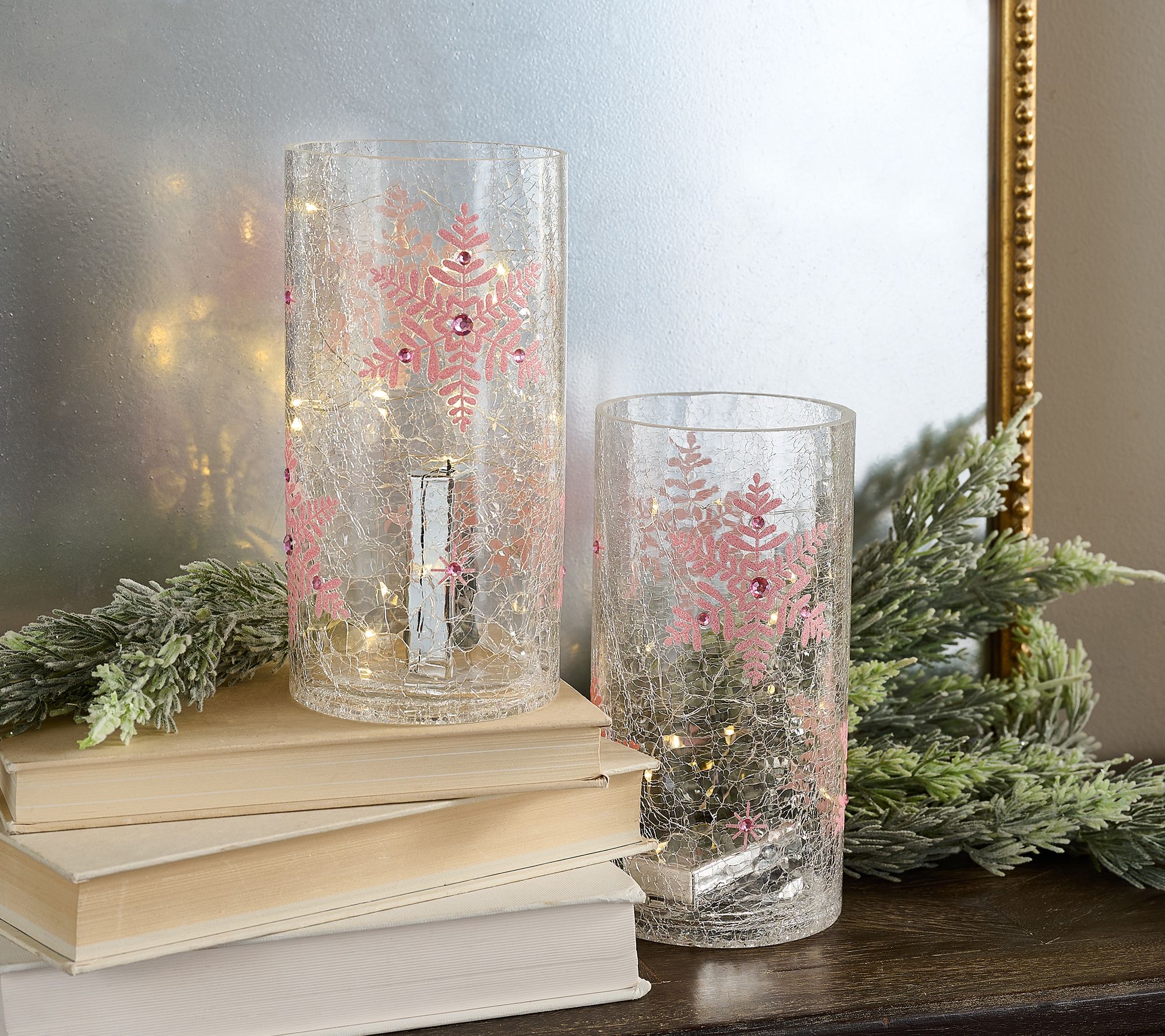 Set of 2 8" Lit Crackle Glass Hurricanes with Snowflake by Valerie