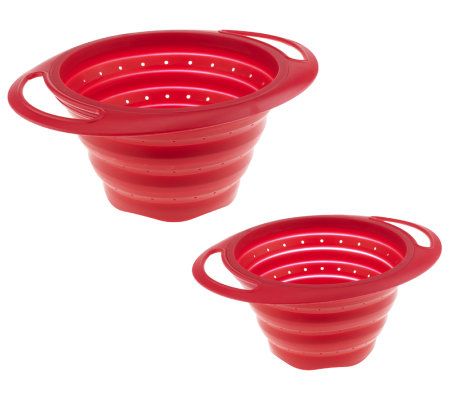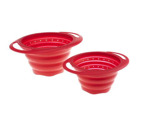 Take the strain out of cooking. Maximize storage and make meal prep easier with these collapsible colanders. Their adjustable height fits even shallow pots and bowls, and their wide tops shield your hands from escaping steam. When you're finished, they collapse completely, keeping a low profile in your cabinet. From MarkCharles Misilli.