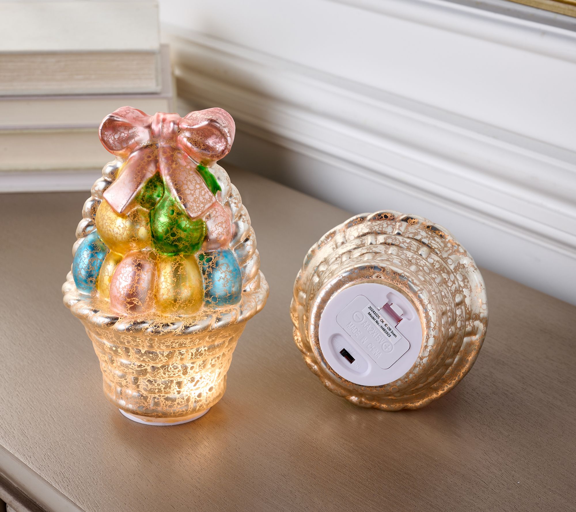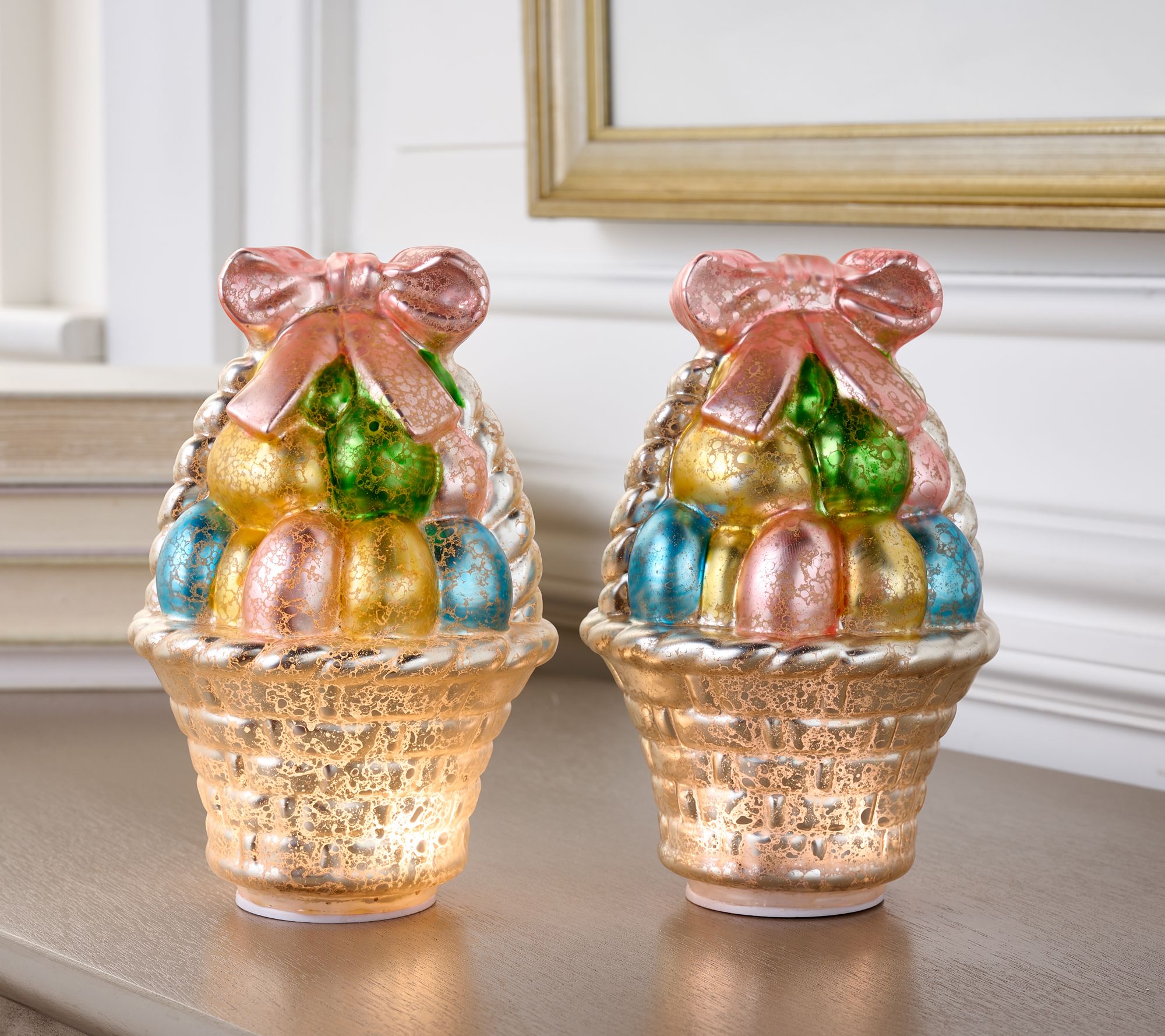 • Includes two illuminated mercury glass egg baskets