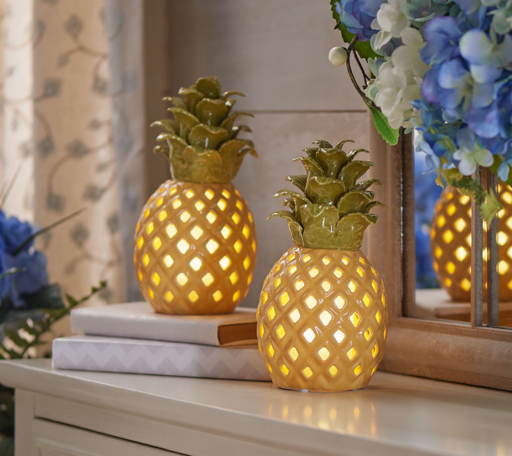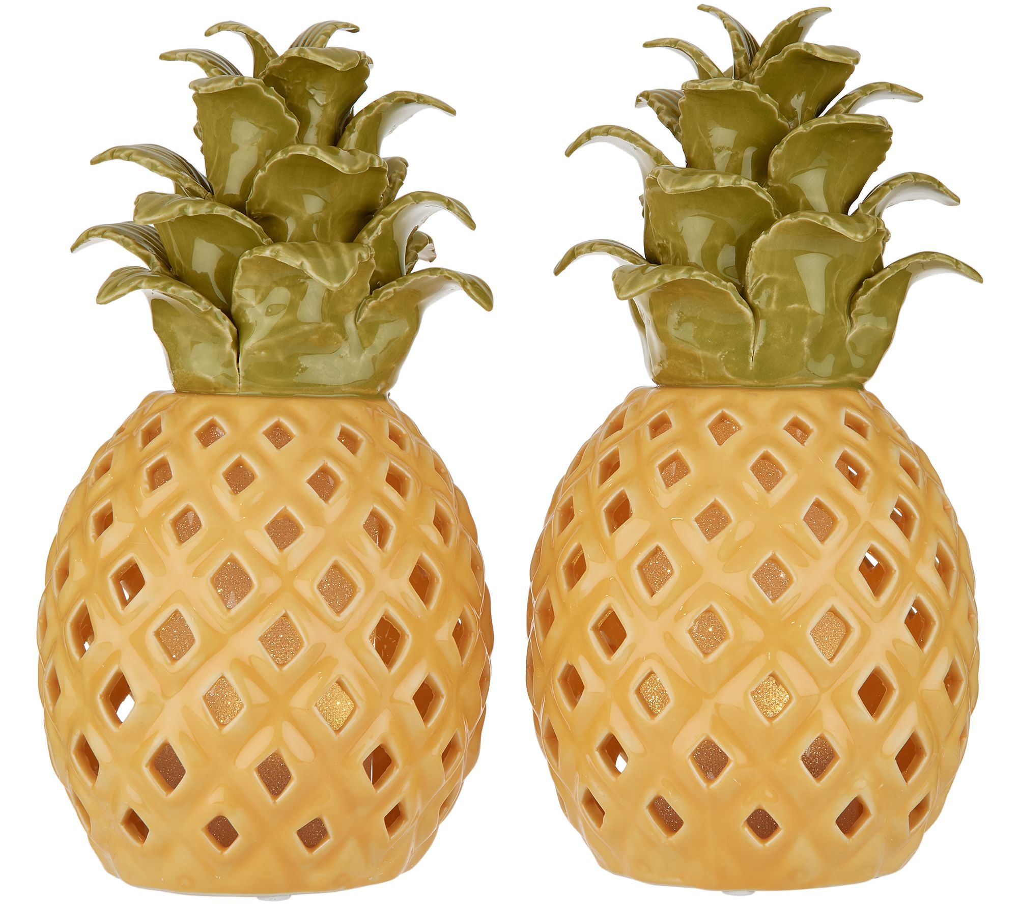 Bring that beach-strollin', drink-sippin', fun-havin' tropical vibe straight to your home with this bright set of ceramic illuminated pineapple luminaries. From the Valerie Parr Hill Collection.