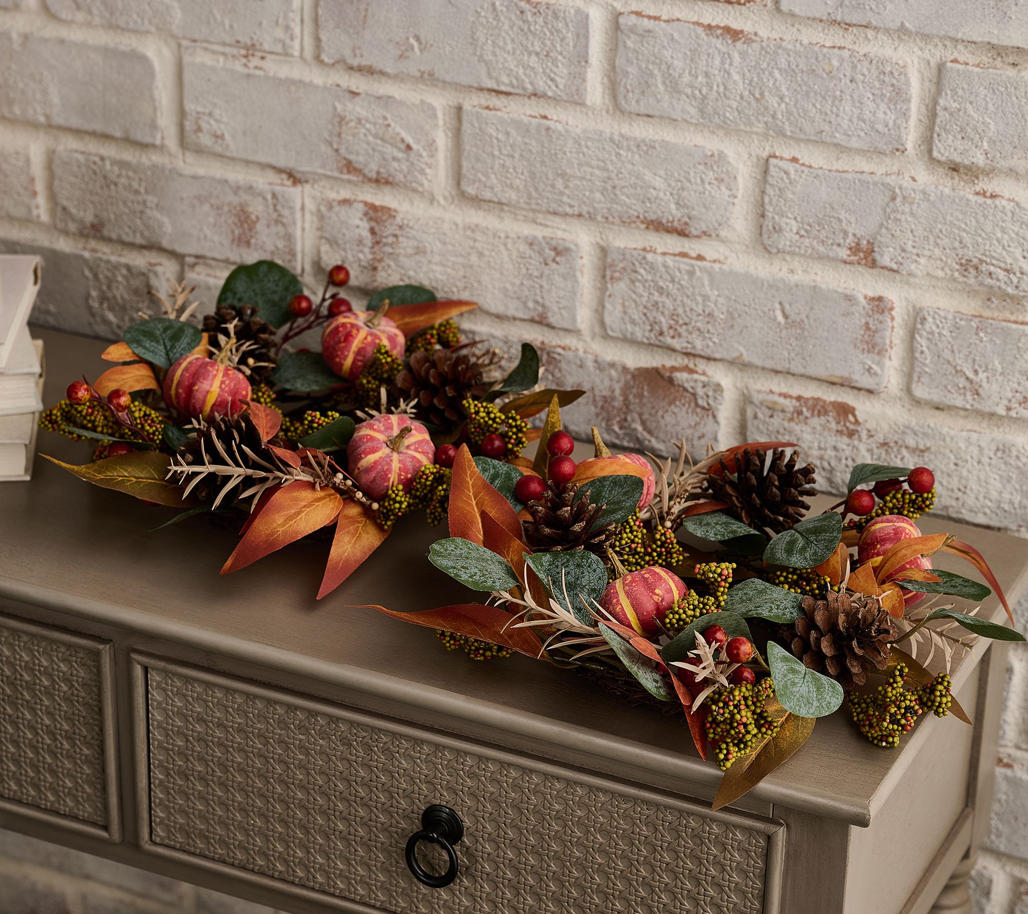 • Faux pumpkins, pinecones, eucalyptus, assorted harvest foliage, and leaves