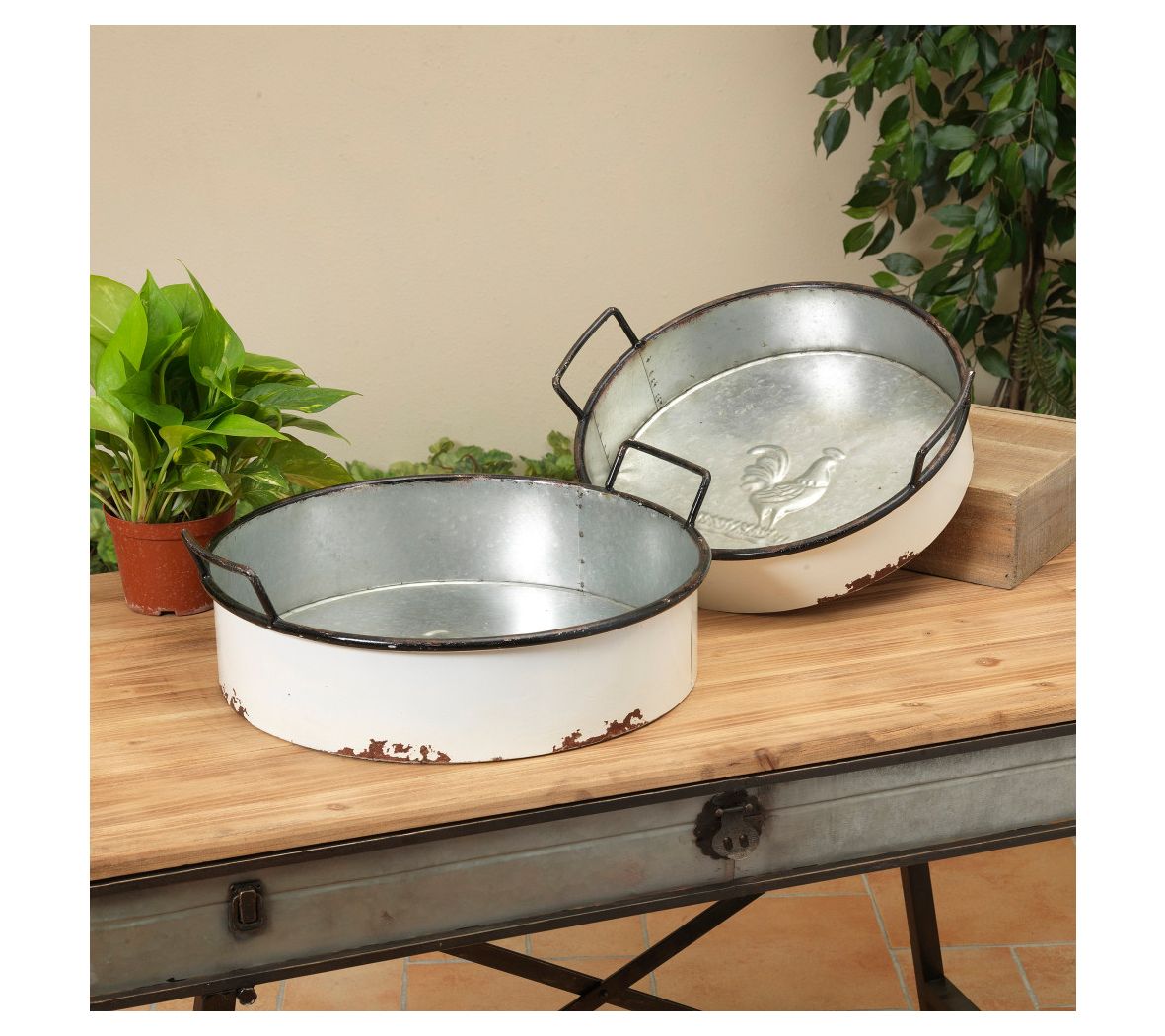 Add a touch of rustic elegance to your home with this set of two round nesting metal trays. Whether you're arranging candles, displaying plants, or setting the scene with seasonal decorations, these versatile trays help create a beautiful focal point in any room. From Gerson International.