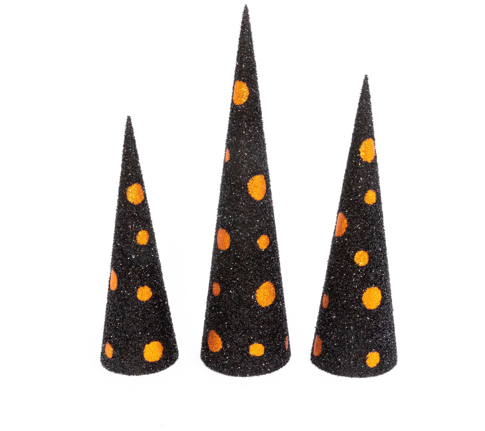 With simple style and enduring charm, this set of three glitter Halloween cone trees will add some sparkle to your fall decorating. Black with orange polka dots, these fashionable decorations are sure to please. From Gerson.