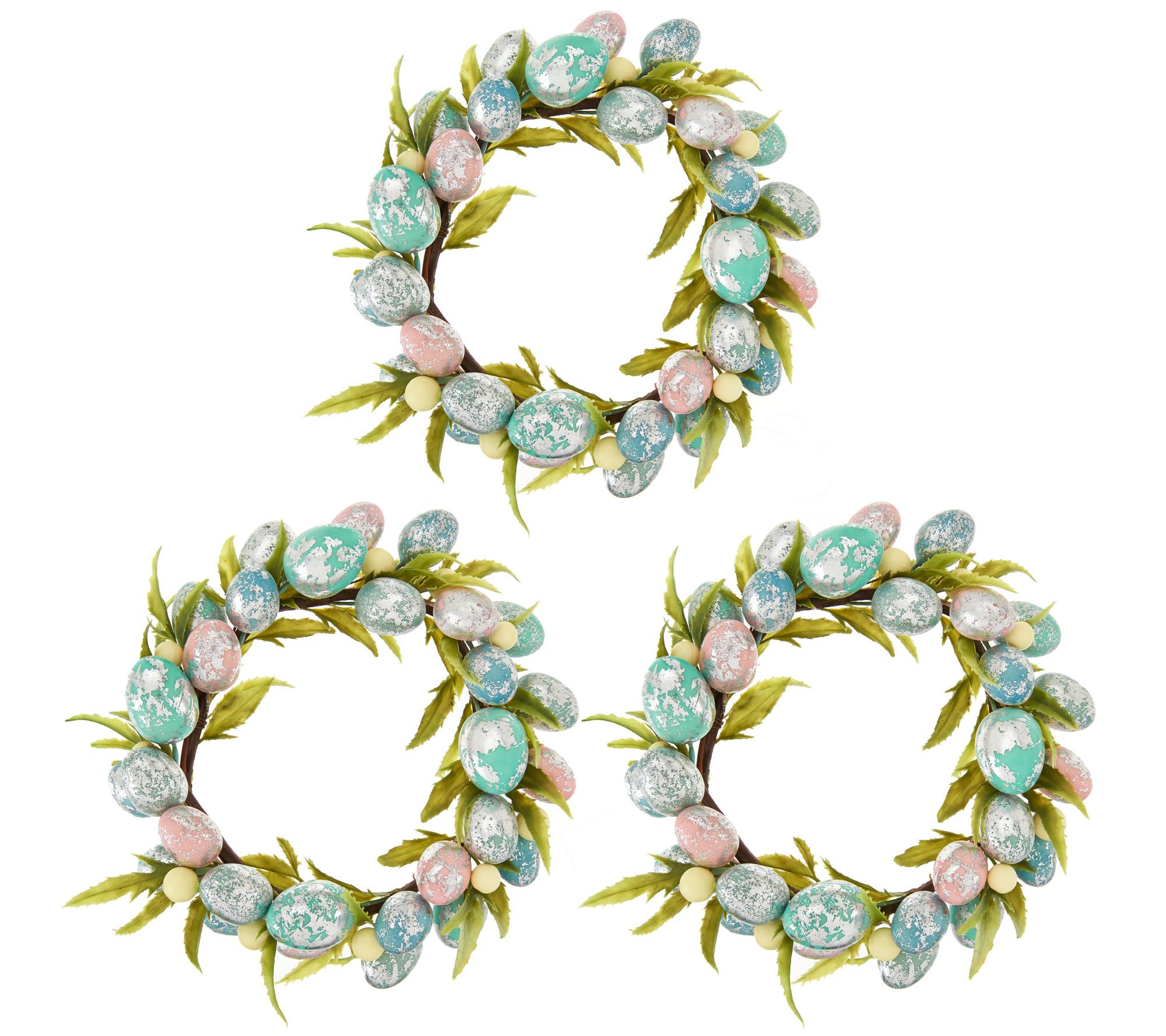 Lovely accents for scented candles or dining table centerpieces, these three decorative rings from Valerie Parr Hill offer springtime beauty to your decor. Foil-look eggs in a variety of bright hues are accompanied by realistic green leaves and ivory berries to create the Easter-inspired look. From the Valerie Parr Hill Collection.