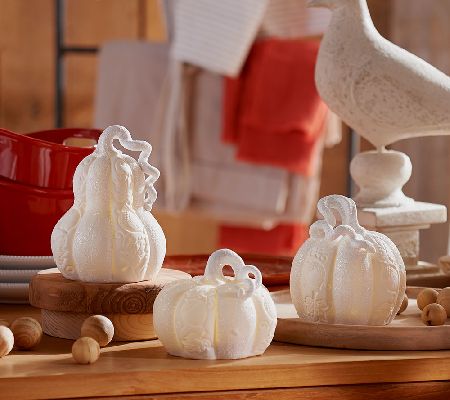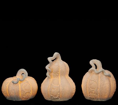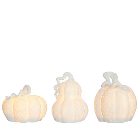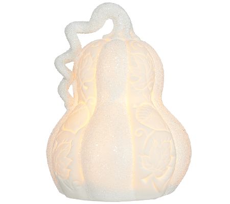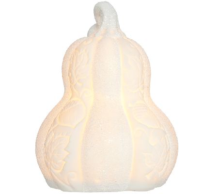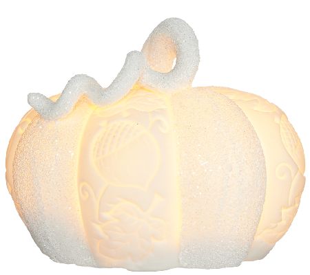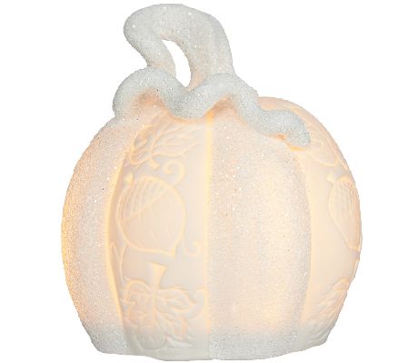Elegantly crafted of porcelain and beautifully adorned with an embossed acorn and scroll pattern, these Home Reflections decorative pumpkins light up for an inviting glow. White glitter adds a sprinkle of sparkle to each. From Home Reflections(R) Flameless Decor.