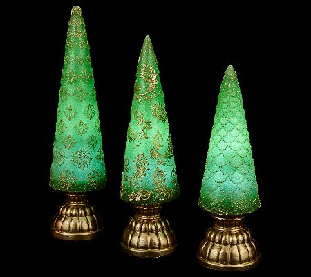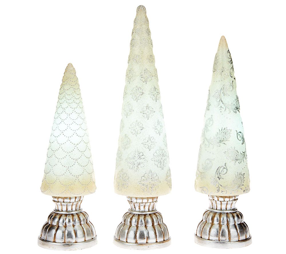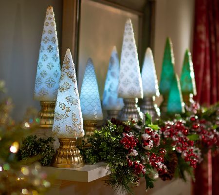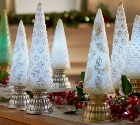 Warming and elegant, these finial trees by Valerie illuminate your home with sophisticated shine. Their embossed design and subtle glitter texture add festive flair to any fireplace mantel or holiday table. From the Valerie Parr Hill Collection.