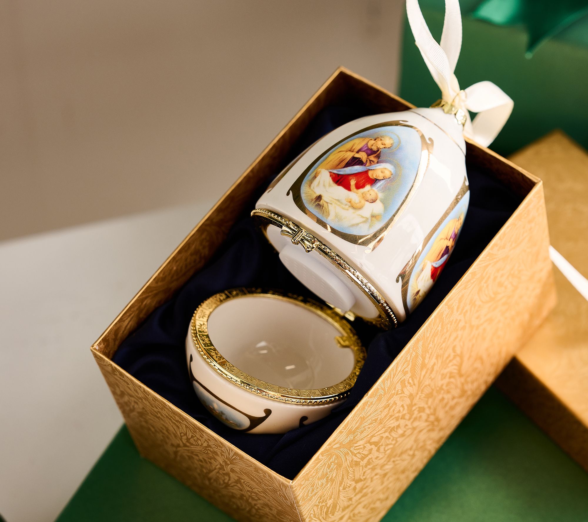 When opened, each egg plays a different recorded Christmas hymn played by Valerie Parr Hill on her piano