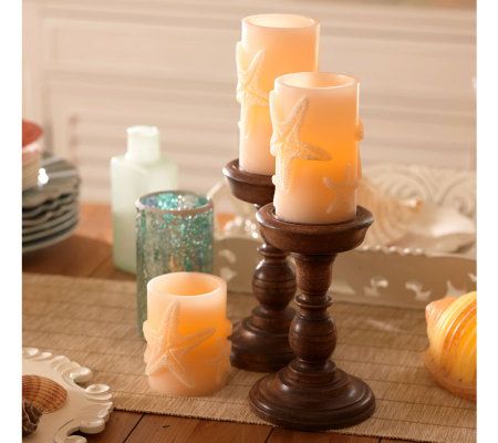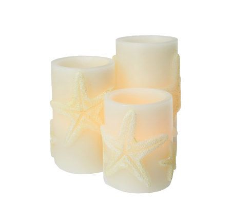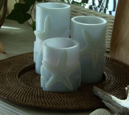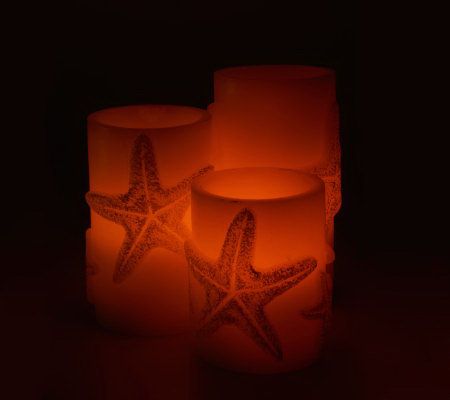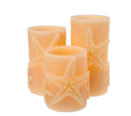 Star power. The perfect addition to any home with a nautical theme, this set of three battery-operated luminaries displays embossed starfish designs in various sizes. Use all three together, or spread the light throughout your home. Each features a five-hour timer mode that illuminates the luminaries at the same time every day. From the Valerie Parr Hill Collection.