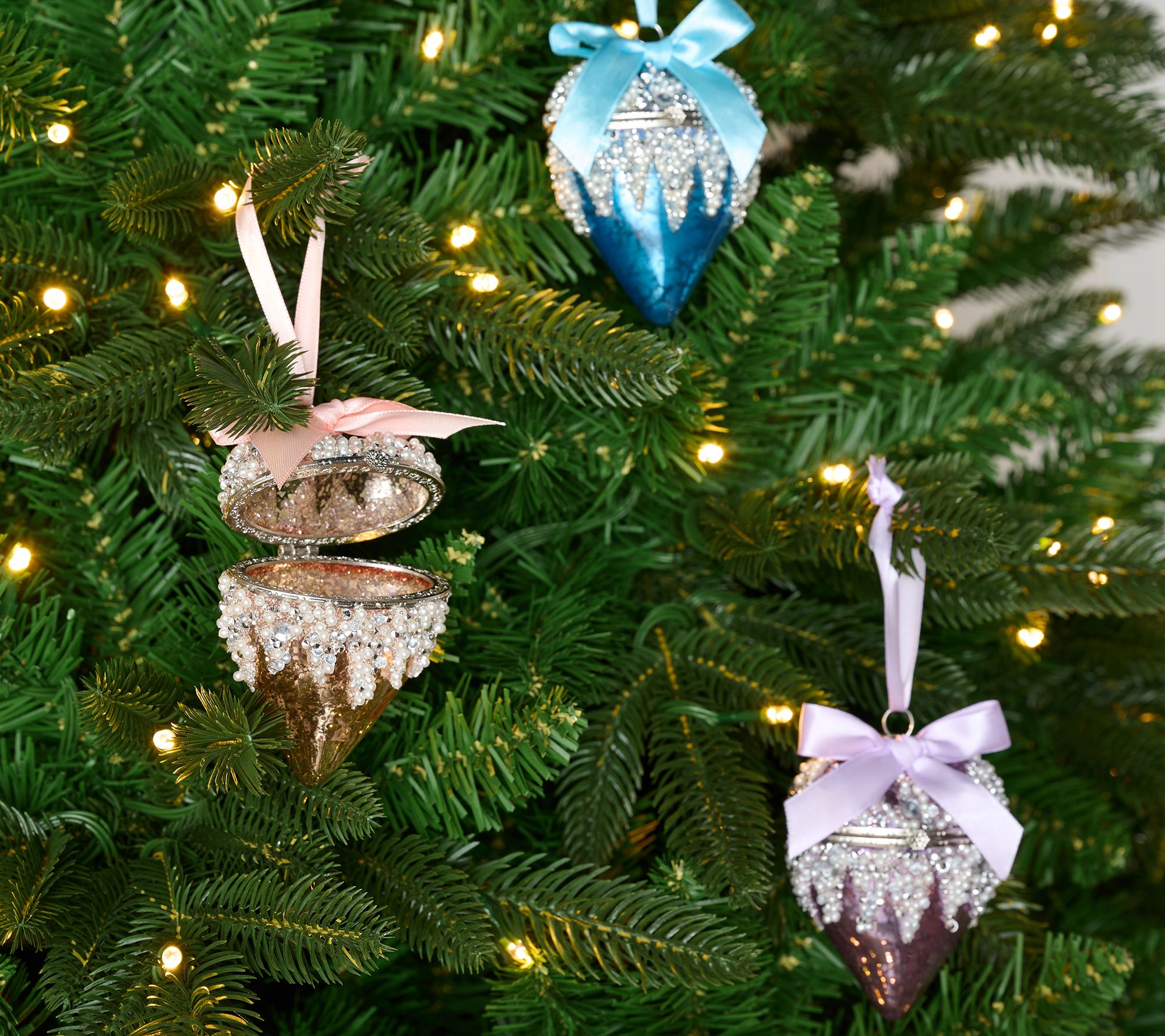 This holiday, share your heart with those you love. These beaded mercury glass heart ornaments are perfect for trimming the tree but also hold a secret: each has a hinged lid, ideal for tucking a special sentiment inside. From the Valerie Parr Hill Collection.