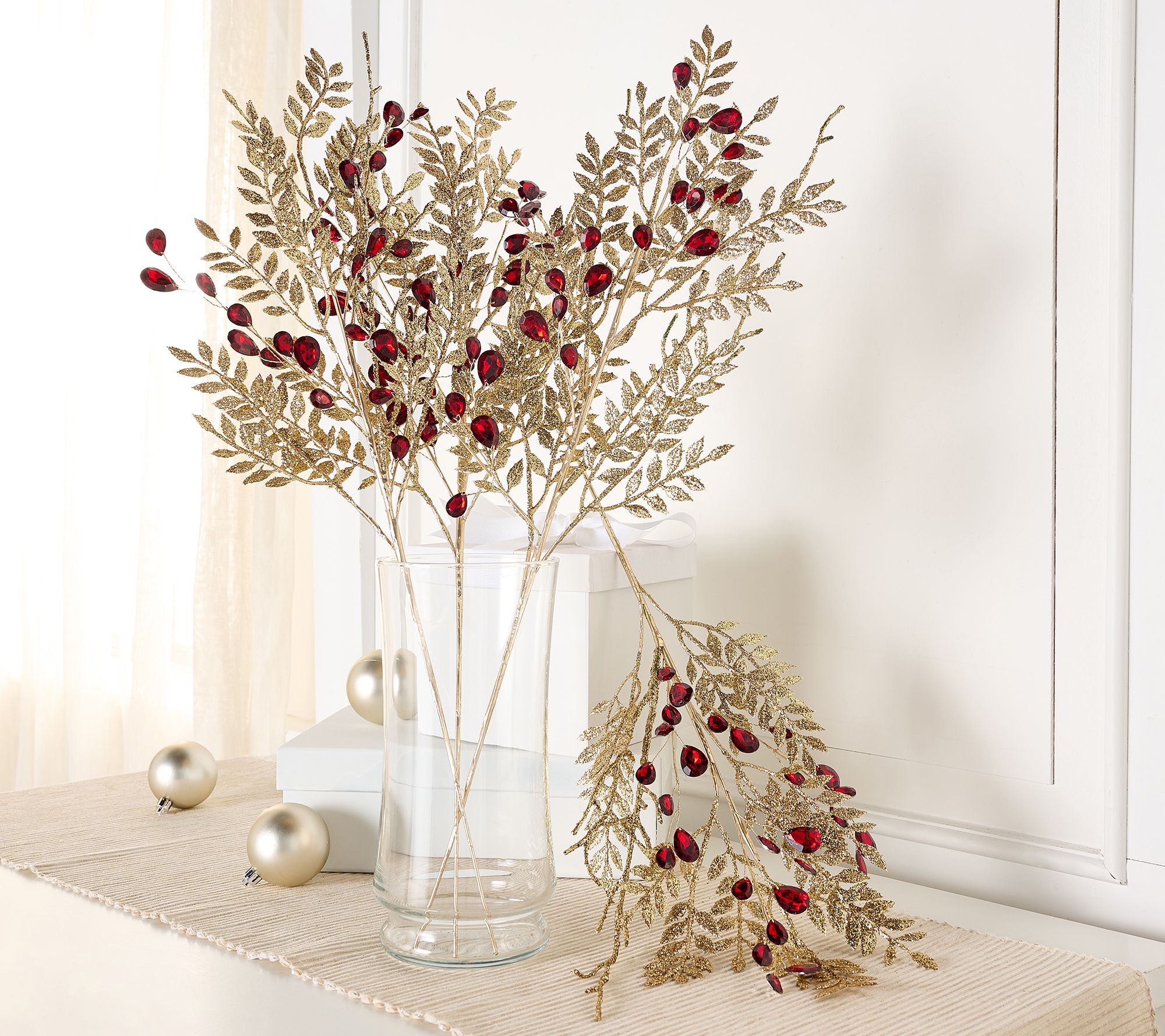 Holiday arrangements gleam a little brighter with these glittered picks nestled into garlands, wreaths, or festive centerpieces. Flexible branches are dotted with shimmering leaves and faceted faux gems, letting you style them just how you want for a personalized sprinkle of seasonal sparkle. From the Valerie Parr Hill Collection.