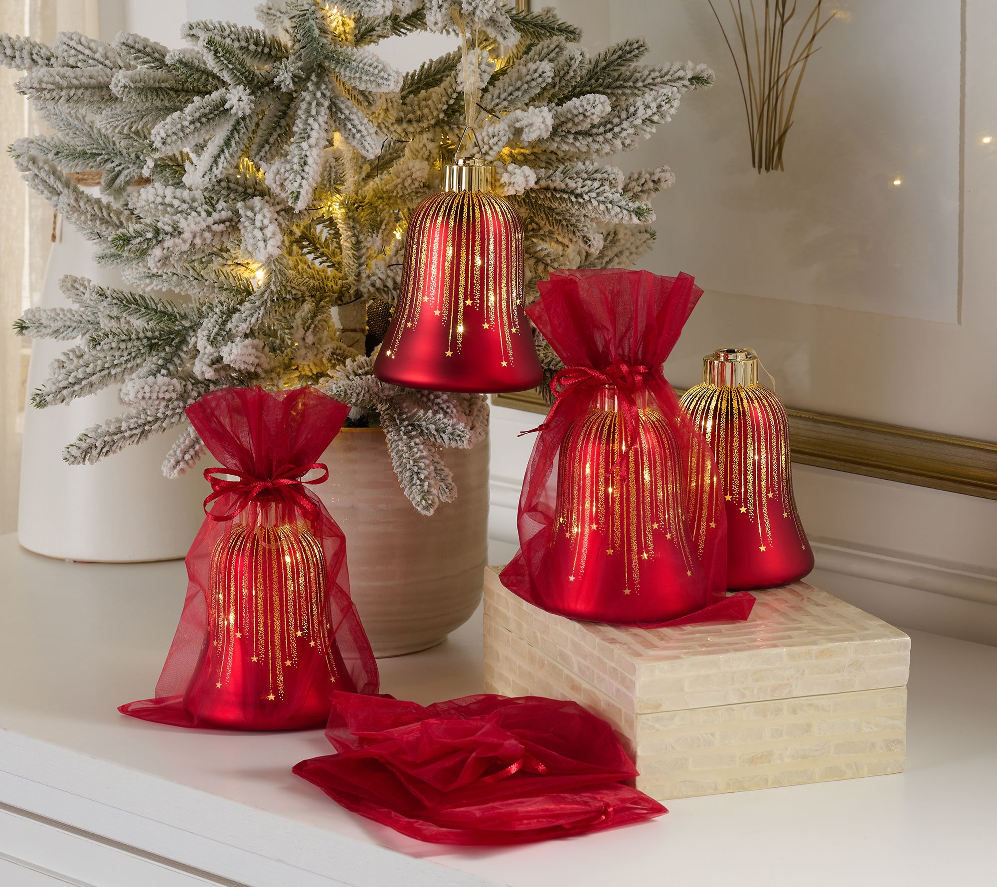 Includes four glass bell ornaments with ribbon hangers and four sheer gift bags