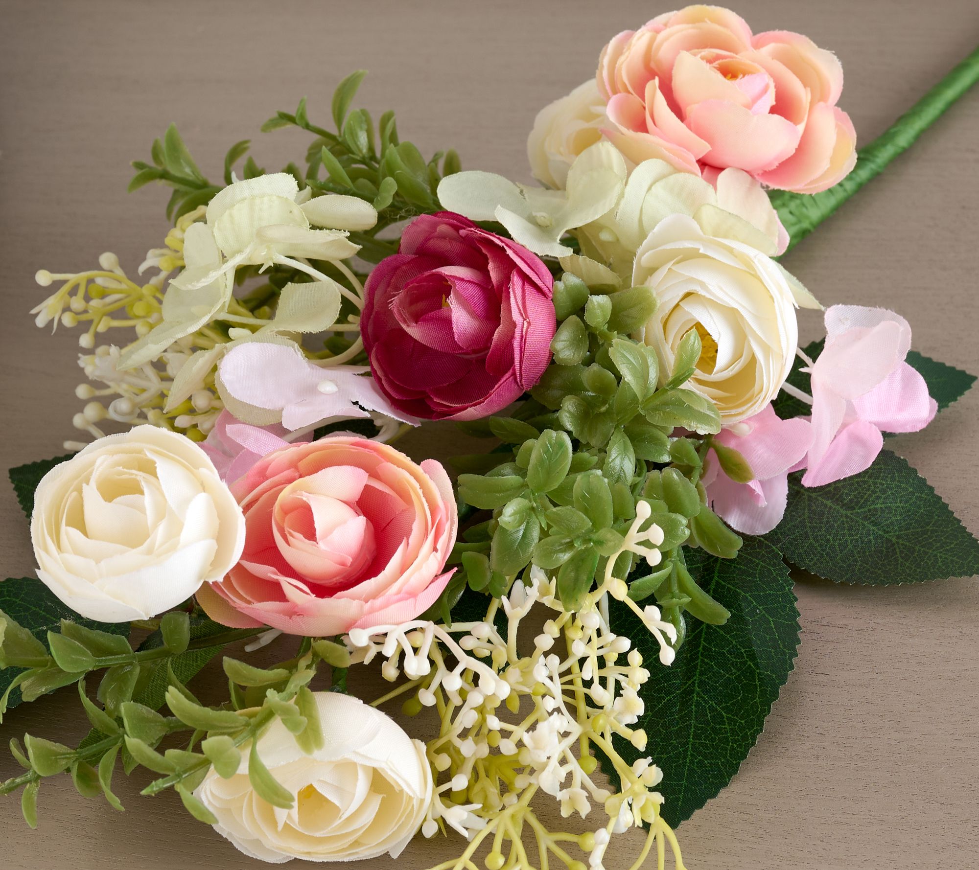 Includes four lifelike ranunculus and boxwood picks