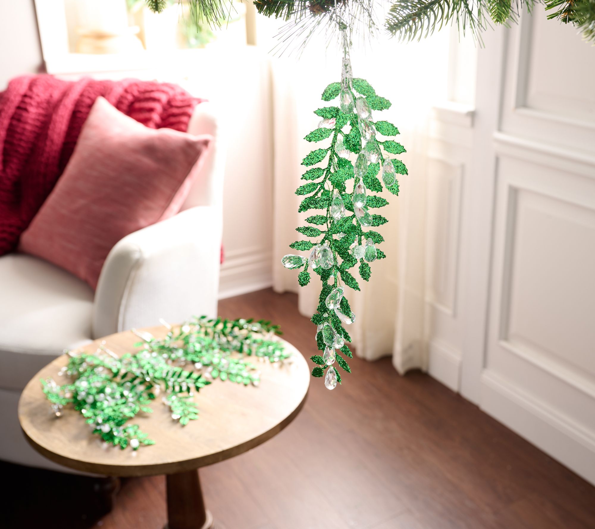 Give your holiday home a merry makeover with this set of six faux leaf stems. The glistening greenery gets its elevated elegance from faceted clear beads and a glittery finish, making these nature-inspired decorations more enchanting than outdoor foliage. From the Valerie Parr Hill Collection.