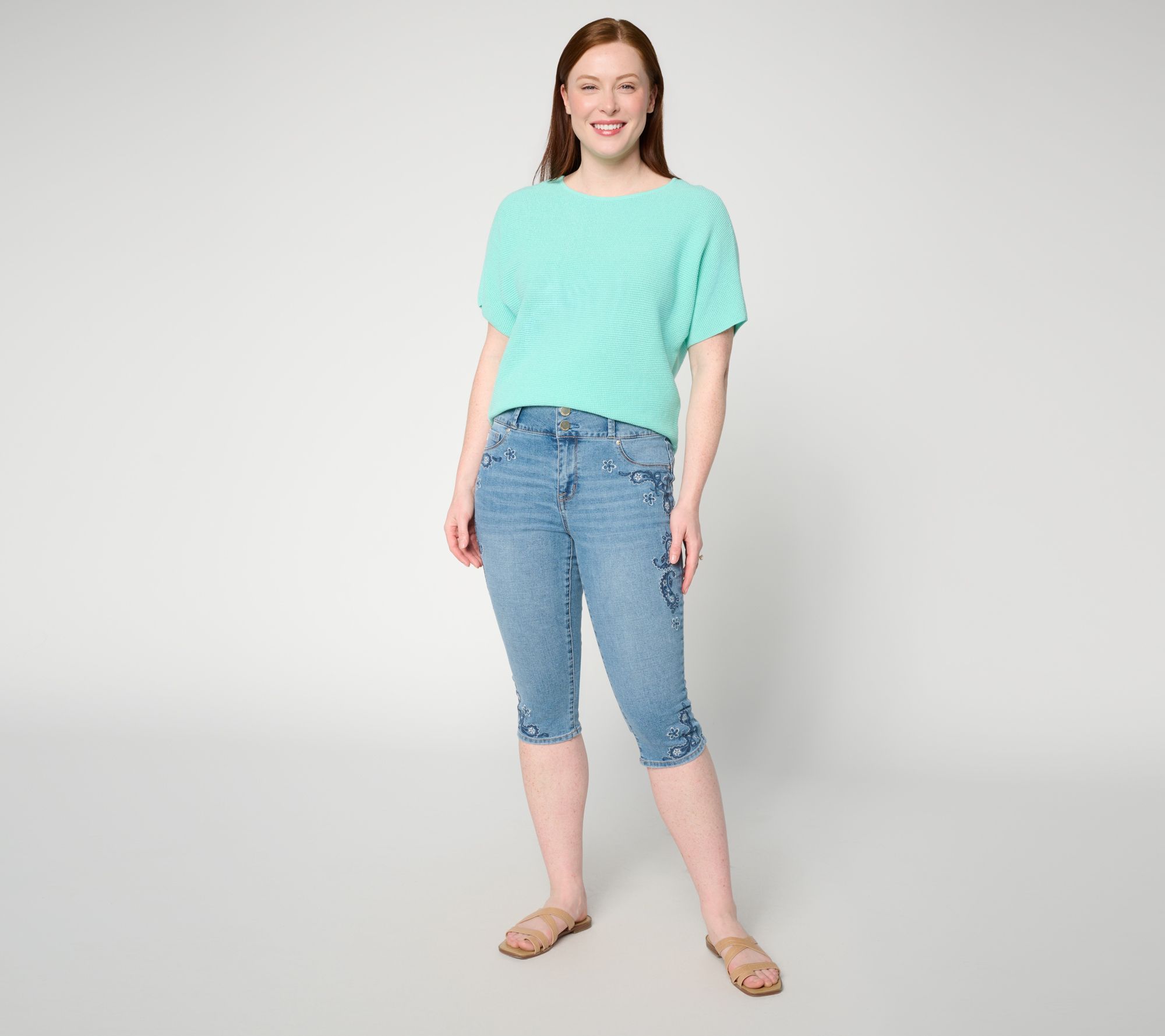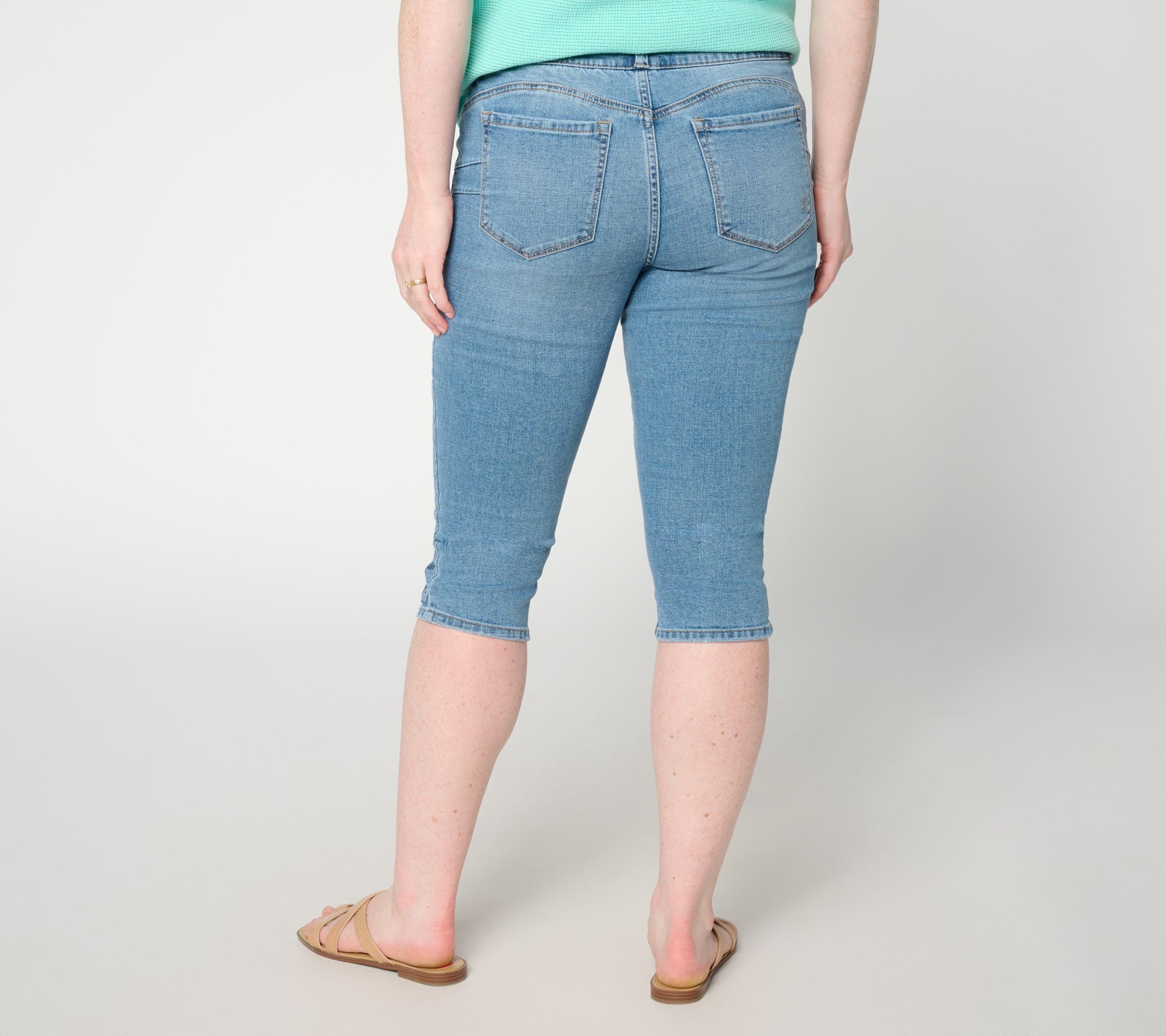 No gap -- no cap! Whether you're heading out for a day of shopping or relaxing on the patio, these No Gap skimmer jeans make the cut with their stretchy fabric and waistband that fits smooth all the way around. The skimmer length plays nice with sneakers, sandals, and lots of sunshine. From Seven7 Jeans.
